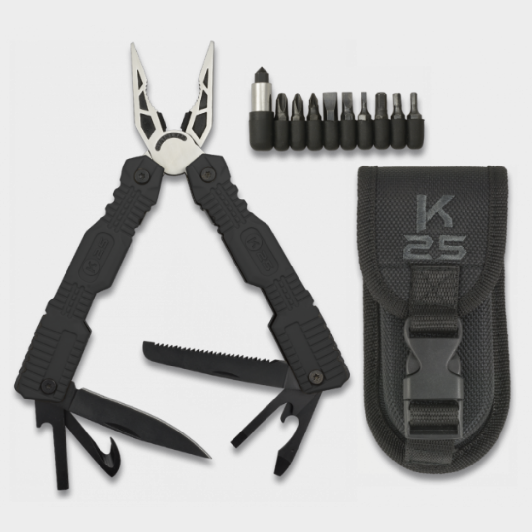 Alicate K25 Multi-Funções Outdoor › Navalhas 35,00 € IVA incluído Partilhar Cor Coyote Preto Quantidade Comprar Contactar Descrição: Copyright ©Alicate multiusosCabo: emborrachadoTamanho total: 17 cmUsos: 19Conjunto de pontas (inclui ponta quebra-vidro)Bolsa de Nylon Marca K25