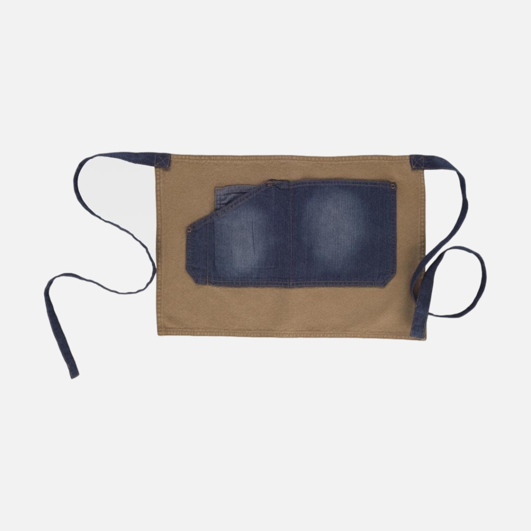 Avental francês curto em tecido de ganga combinado com canvas. Um bolso central de corte assimétrico compartimentado com bolso relojoeiro interior. Fitas de tecido de ganga para ajustar na cintura. Desenho contemporâneo com acabado desgastado e rebites de cobre.