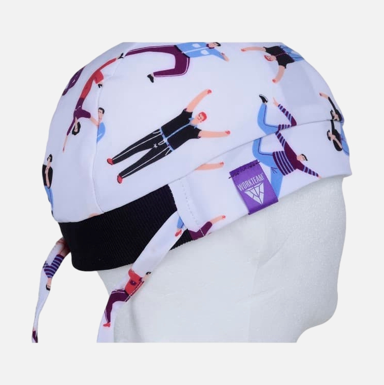 Bandana de tecido elástico e estampada. Ajuste com elástico combinado e cordoes na nuca.