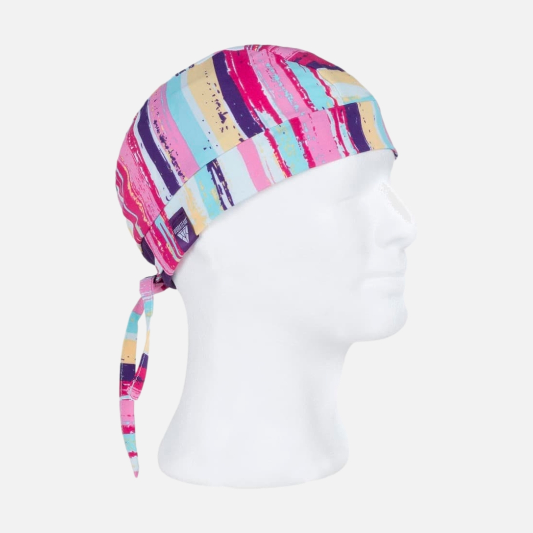 Bandana de tecido elástico e estampada. Ajuste com elástico combinado e cordoes na nuca.
