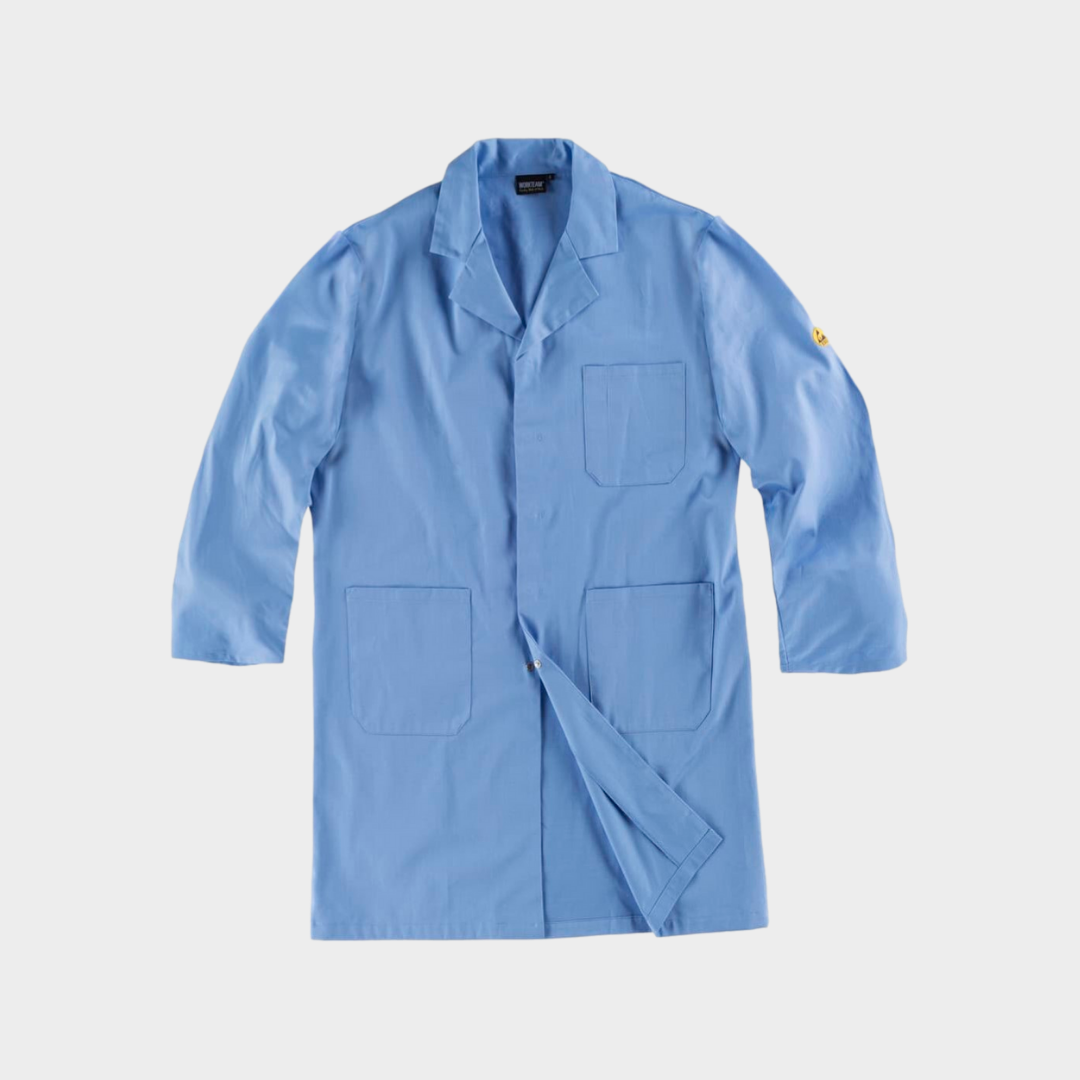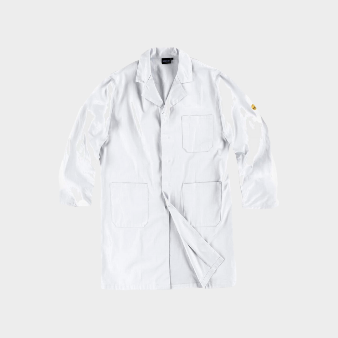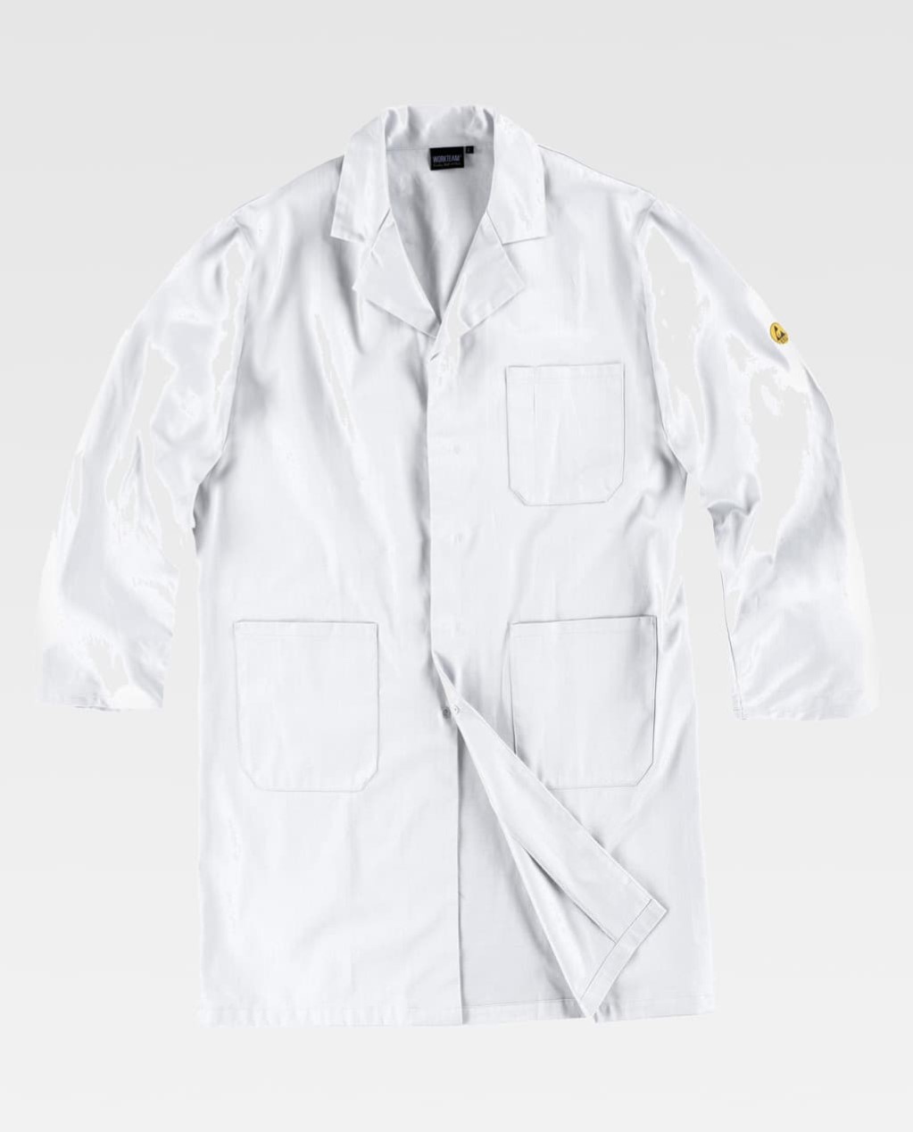 Bata unisex manga comprida com tecido antiestático, com gola, lapela e fecho central de molas ocultas. Um bolso no peito e dois laterais. Um bolso para caneta.
