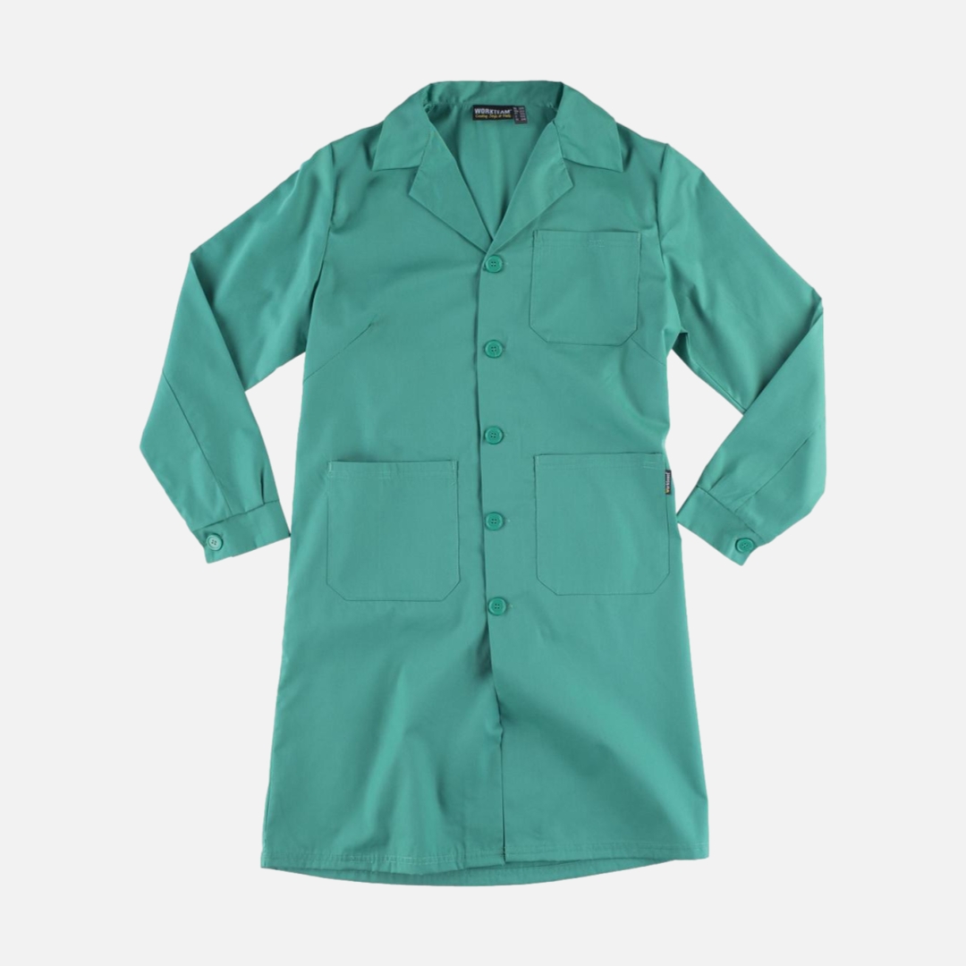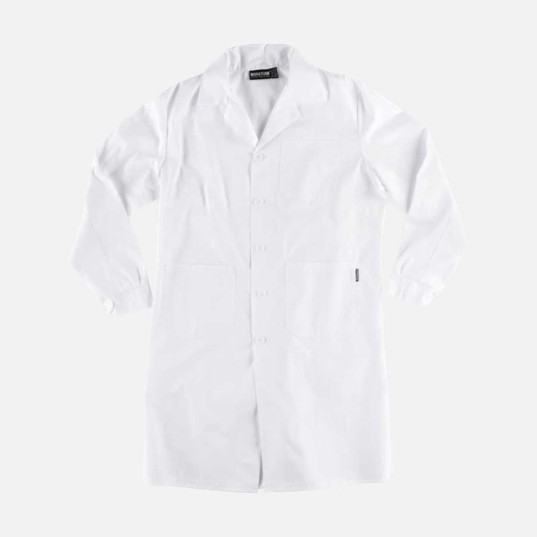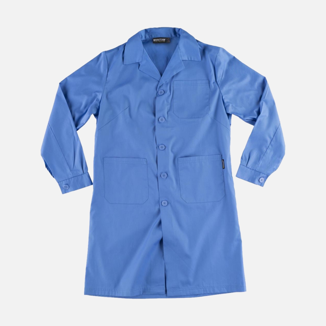 Bata de senhora com gola sobreposta e fecho central de cinco botões do mesmo tom.