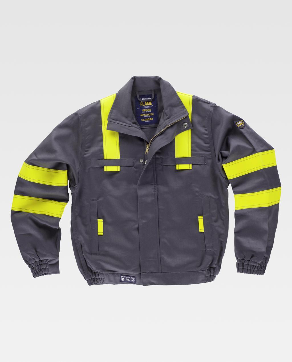 Faixas refletoras ignífugas amarelas nos ombros e nas mangas. Manguito elástico no punho.