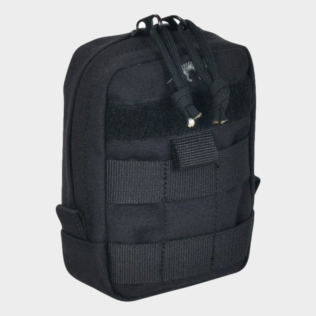 Bolsa com Sistema-Molle de fixação vertical, com um fecho de abertura ampla, tiras de velcro para inscrições. Na parte da frente têm um compartimento de malha. Na parte traseira, duas presilhas elásticas e um anel em D de plástico.
