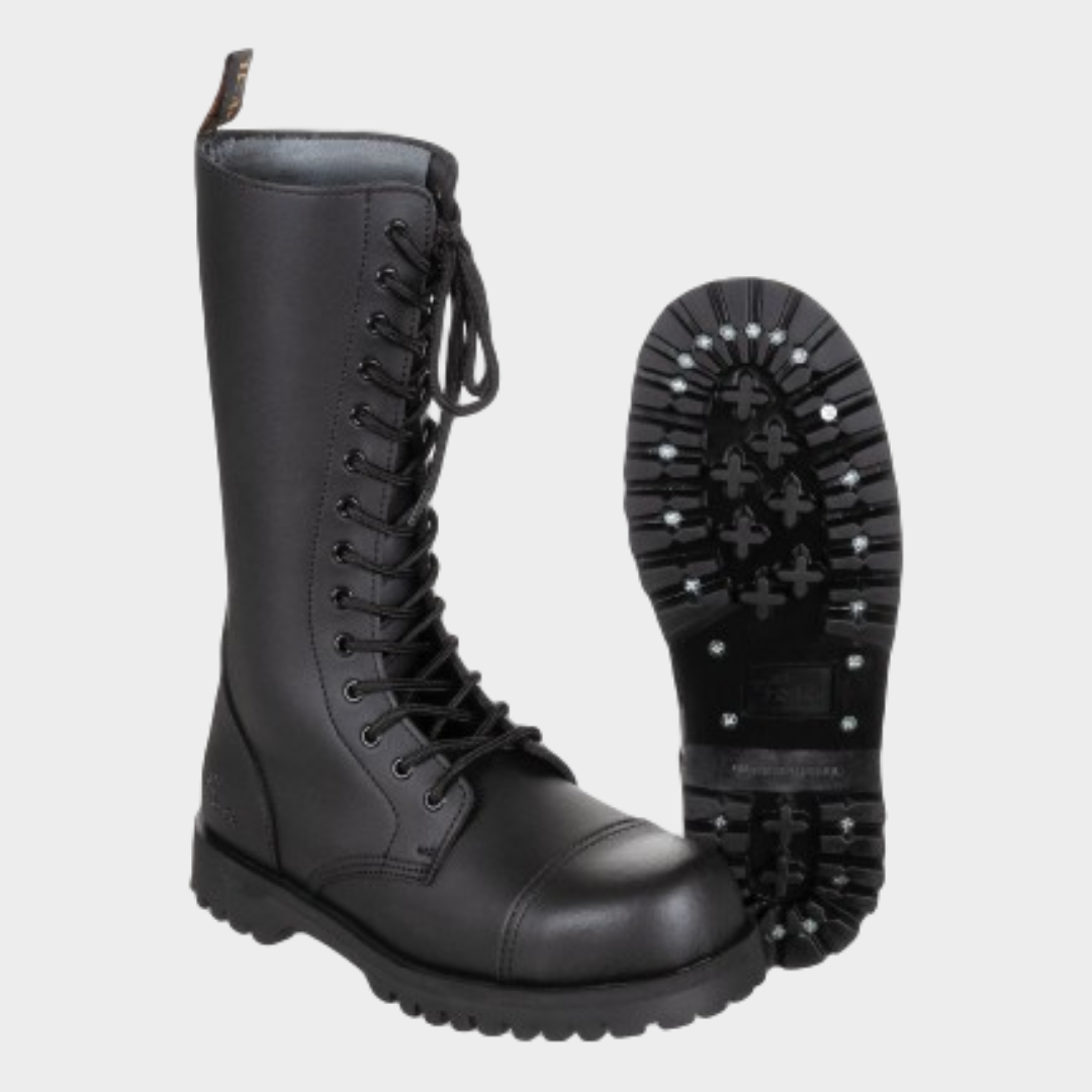 Bota PureTrash 35 cm de altura e com 14 buracos para atacadores. Apresenta couro costurado duplo, atacadores com ilhós de metal e com tampa de aço integrada, palmilha interna removível. Sola aparafusada, colada e costurada o que resulta numa durabilidade acrescida, a sola é também resistente a óleos e gasolia.