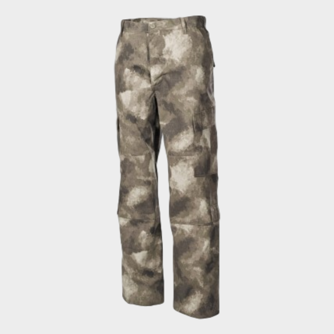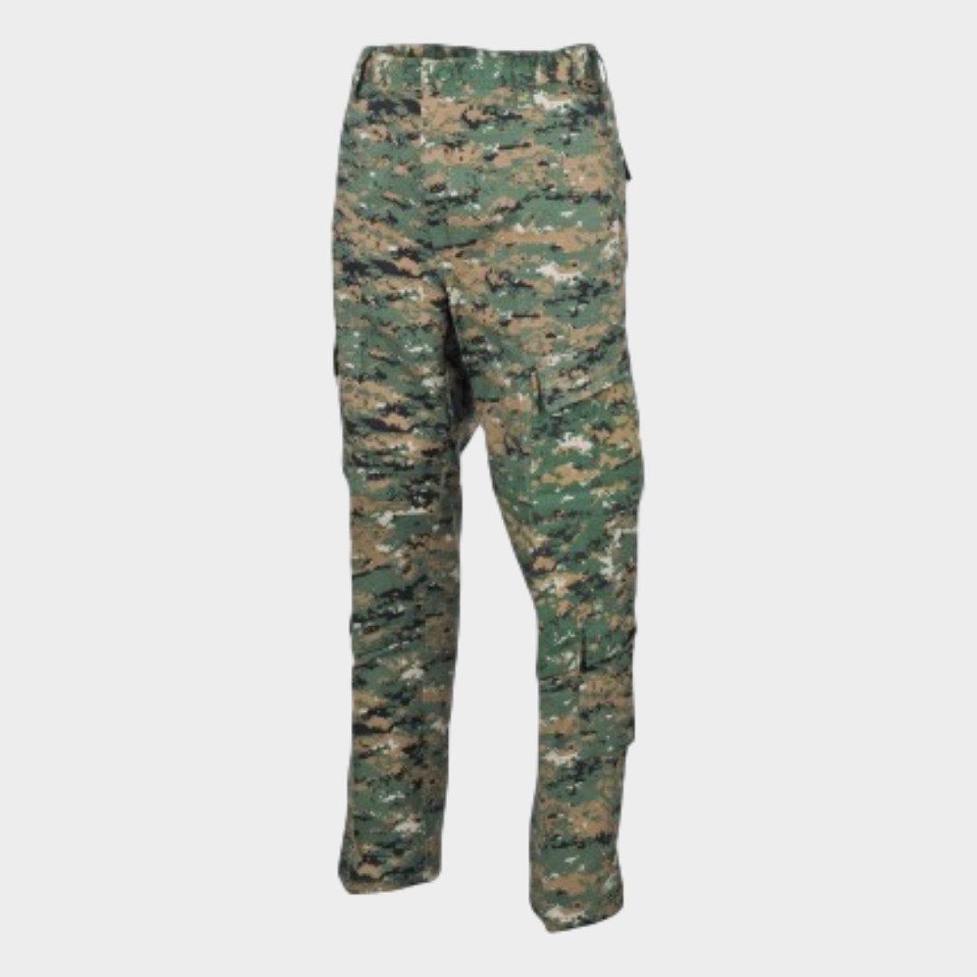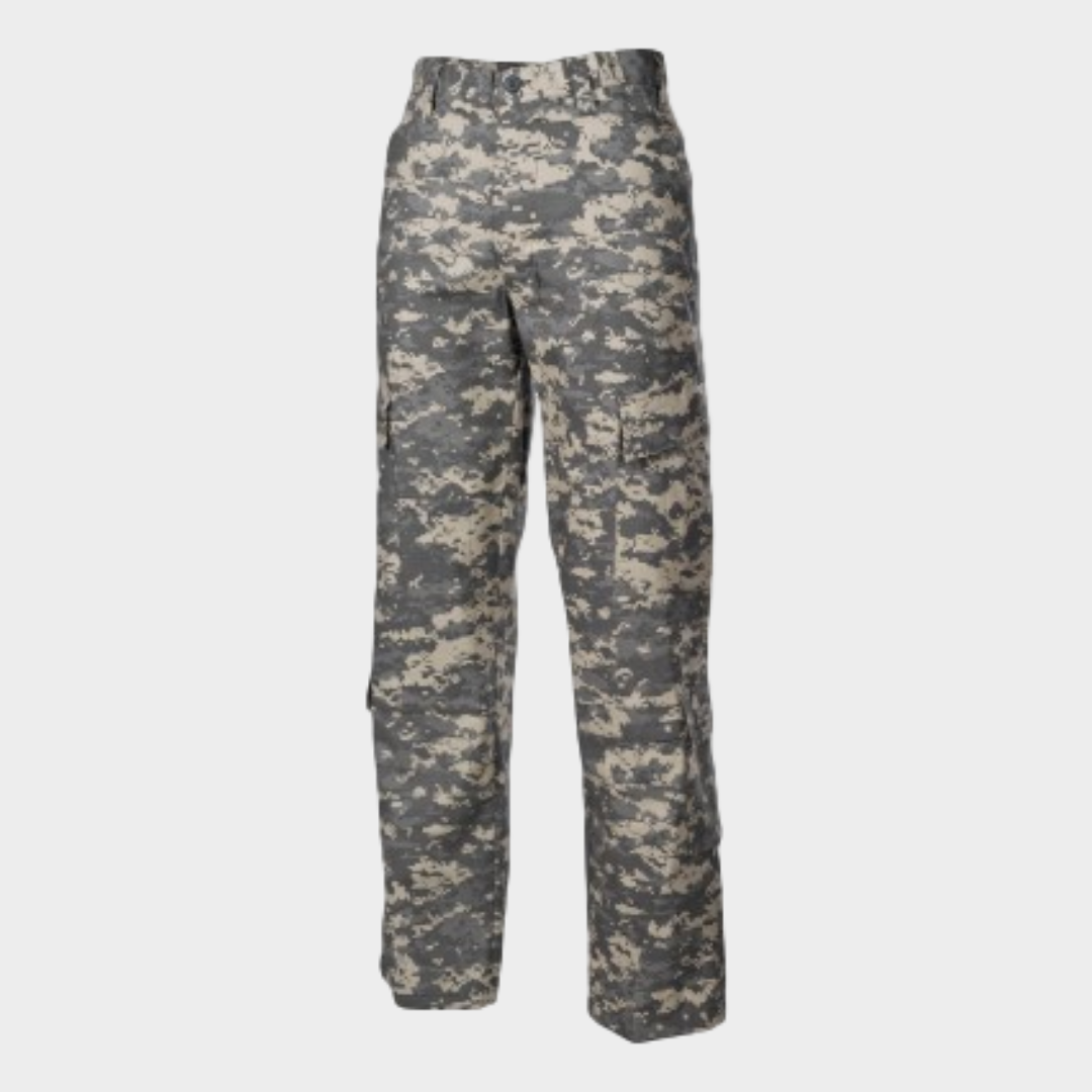 Calças US ACU ARMY COMBAT UNIFORM com cordão na cintura para ajuste de largura. Dois bolsos laterais e dois bolsos traseiros com aba e botões.