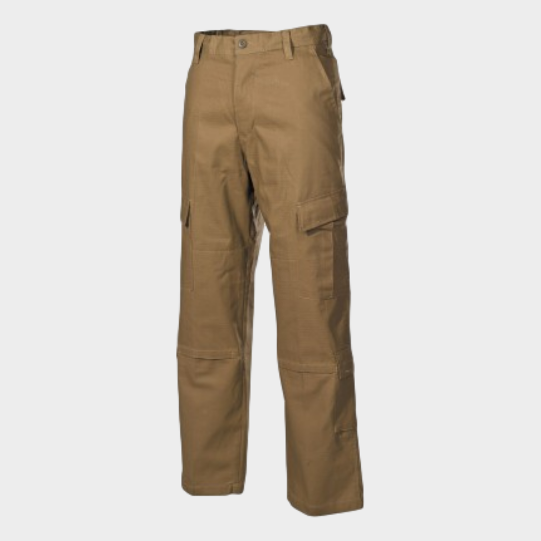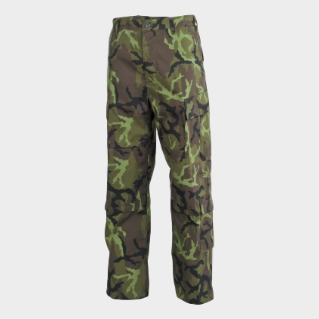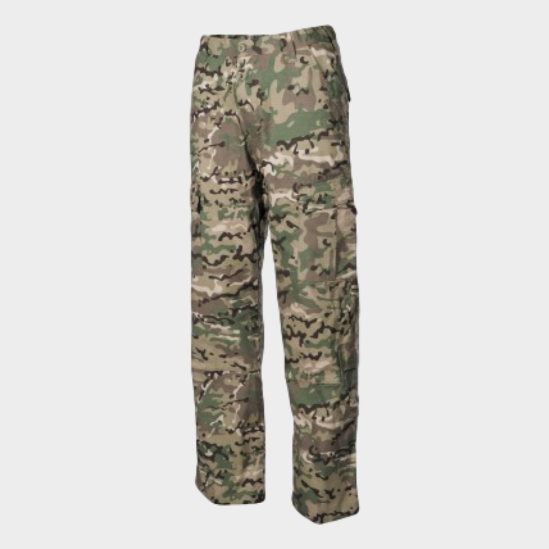 Calças US ACU ARMY COMBAT UNIFORM com cordão na cintura para ajuste de largura. Dois bolsos laterais e dois bolsos traseiros com aba e botões.