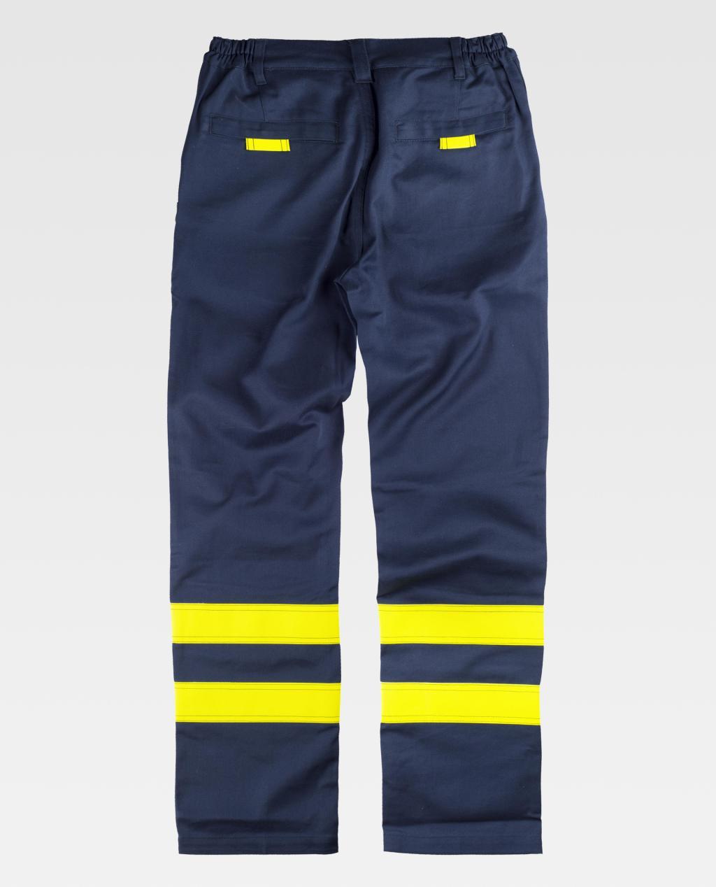 Duas fitas fluorescentes amarelas ignífugas nas perneiras. Elástico na cintura. Passadores.