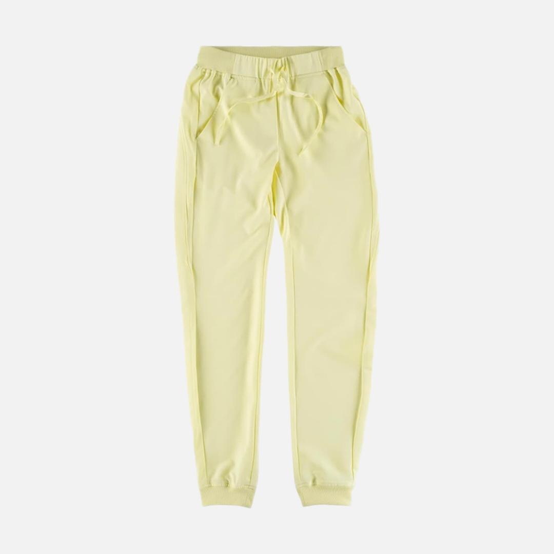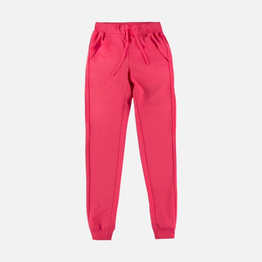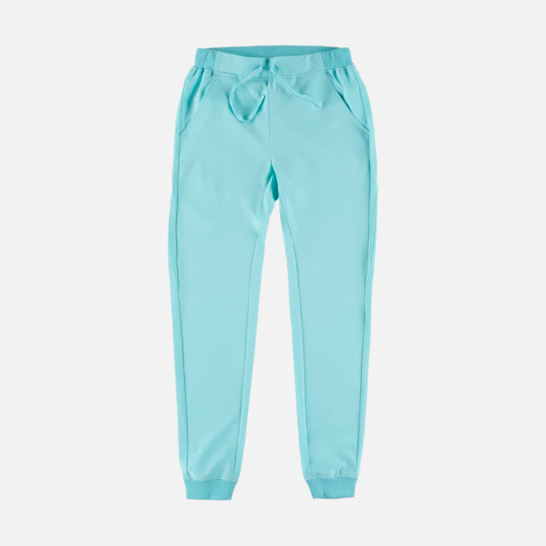 Calça com tecido elástico. Dois bolsos de abertura inclinada nos laterais. Elástico na cintura e ajustável com cordão. Bainha com elástico.