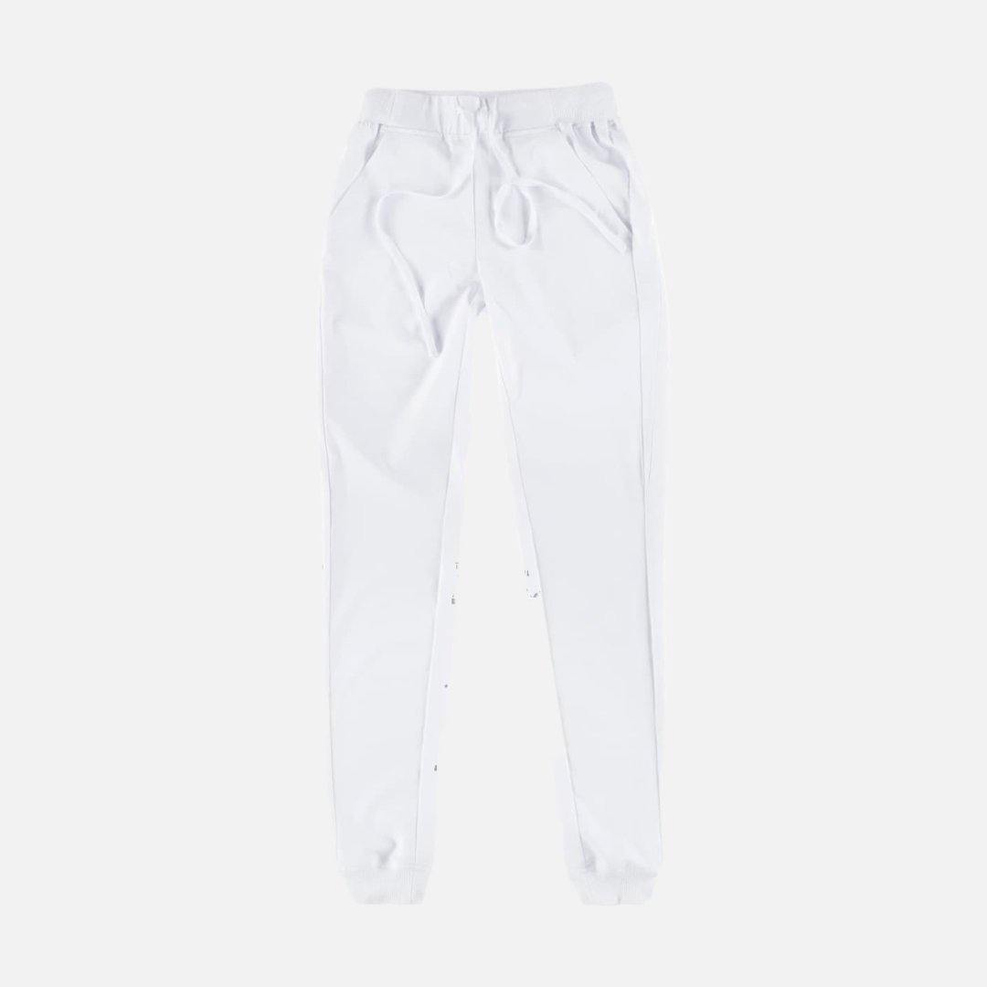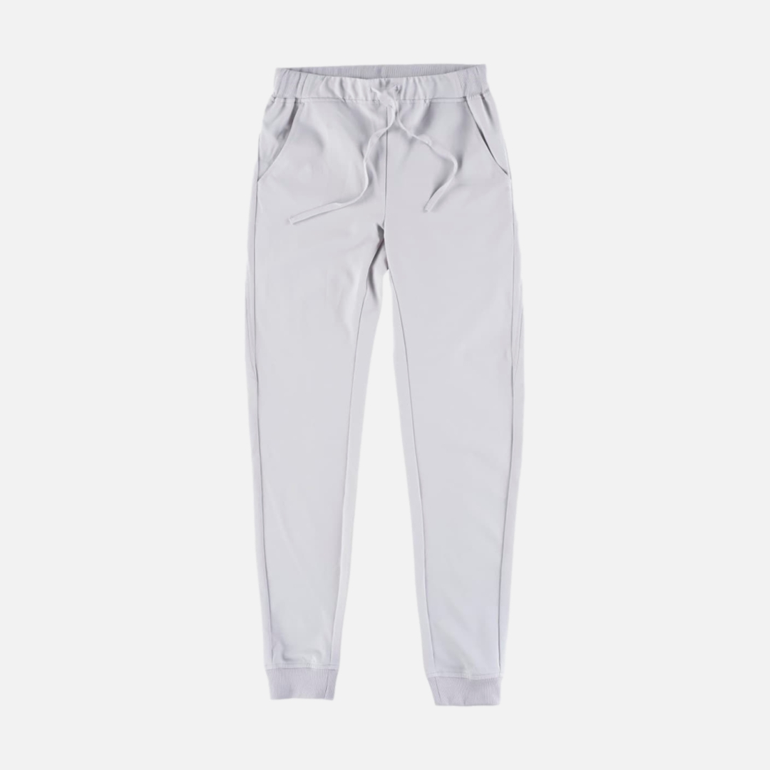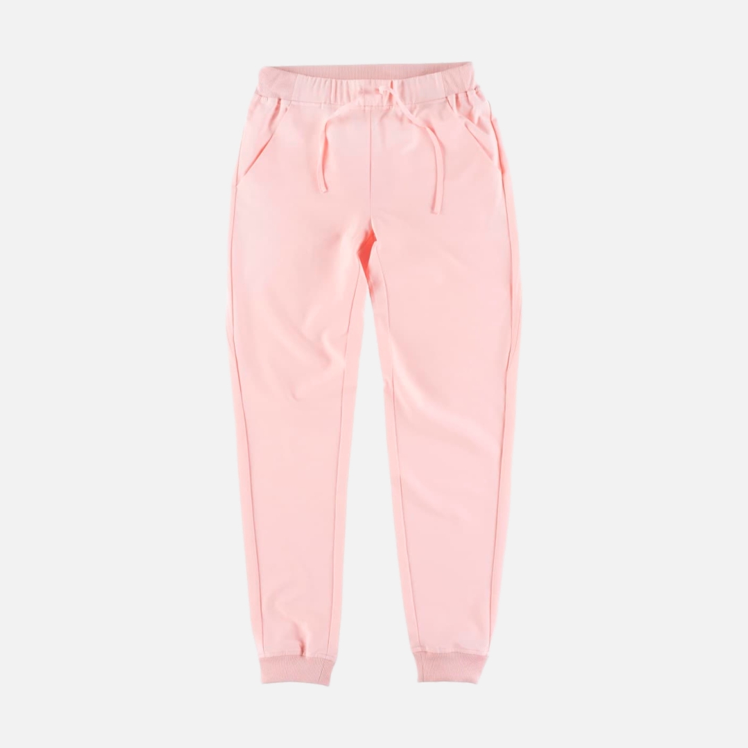 Calça com tecido elástico. Dois bolsos de abertura inclinada nos laterais. Elástico na cintura e ajustável com cordão. Bainha com elástico.