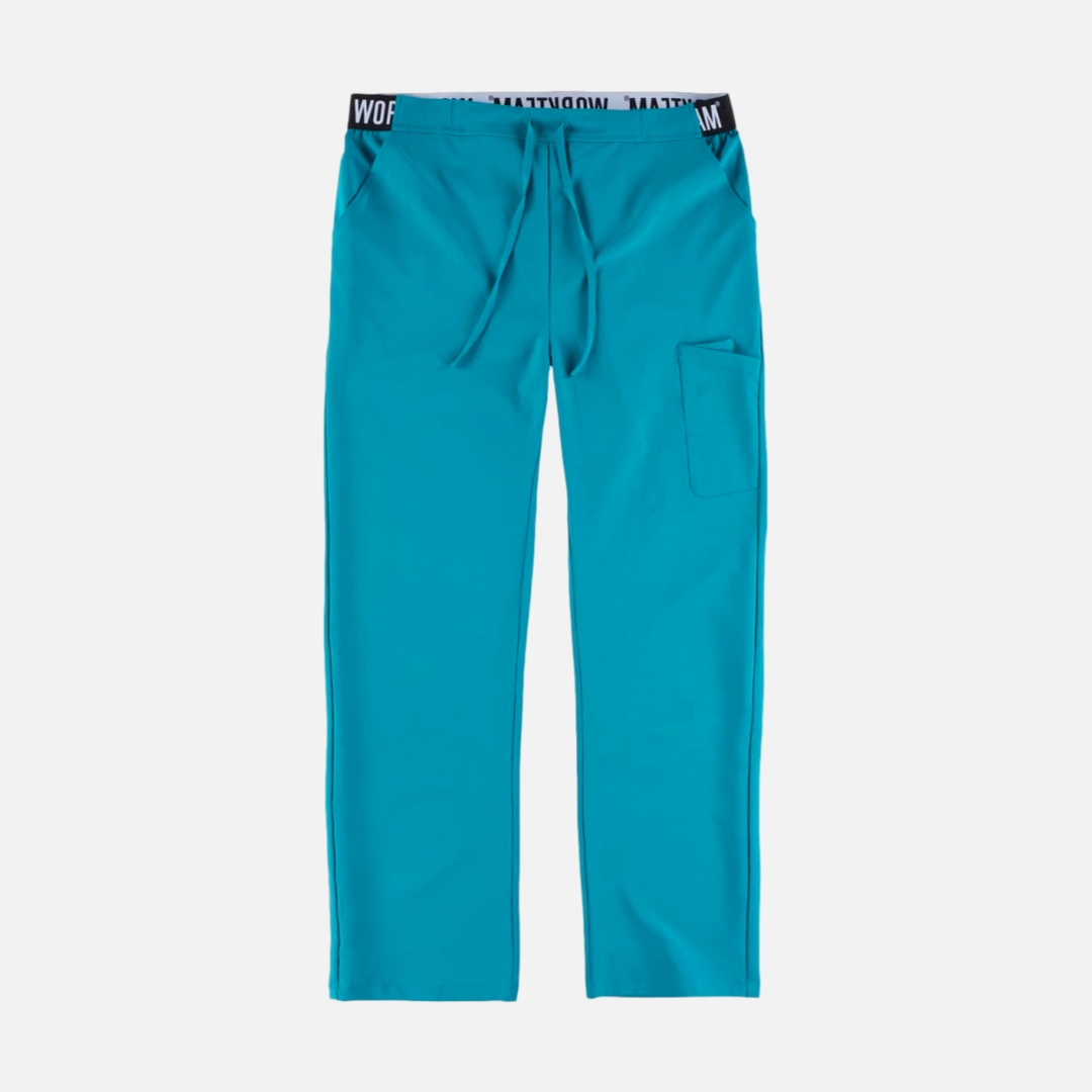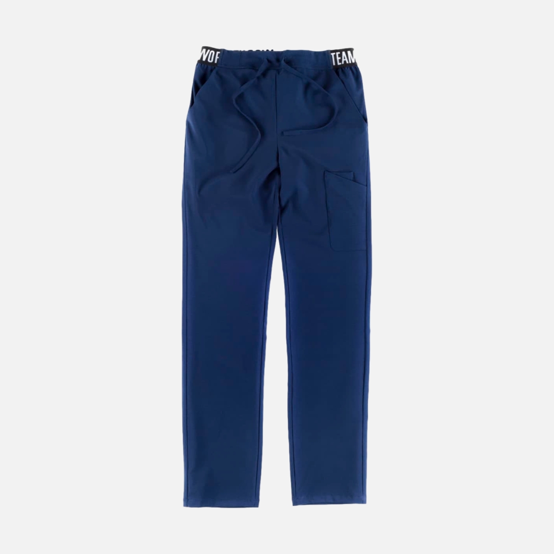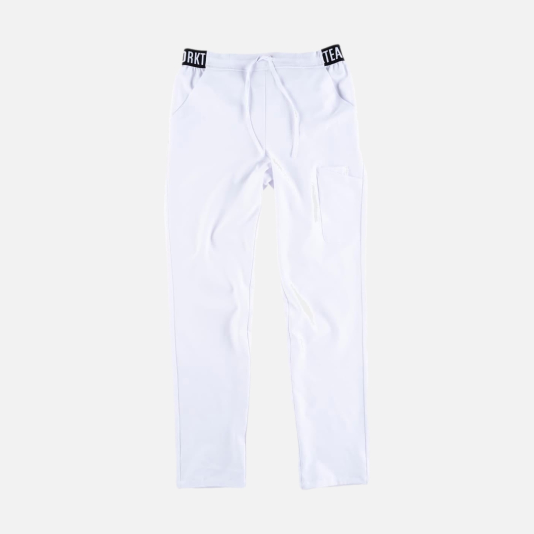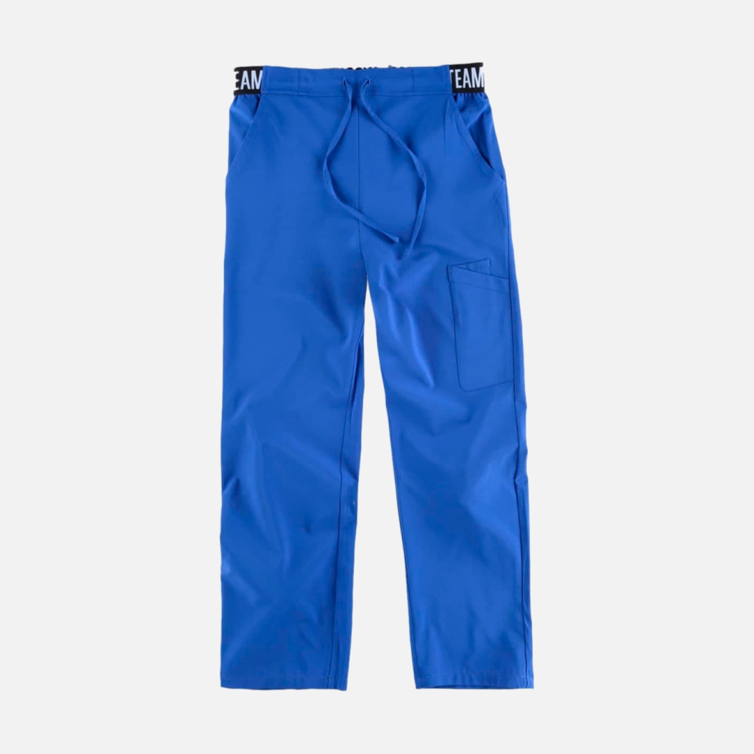 Calça elástica unissexo, dois bolsos arredondados nos laterais. Um bolso duplo de chapa na parte trás. Um bolso traseiro. Elástico na cintura e ajustável com cordão.