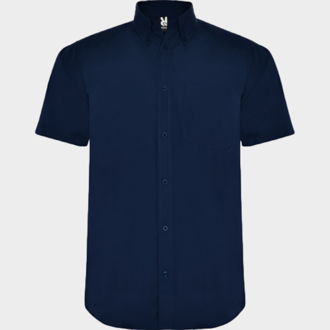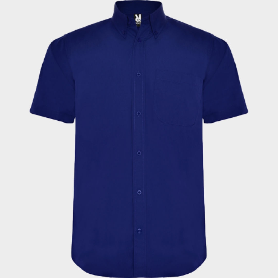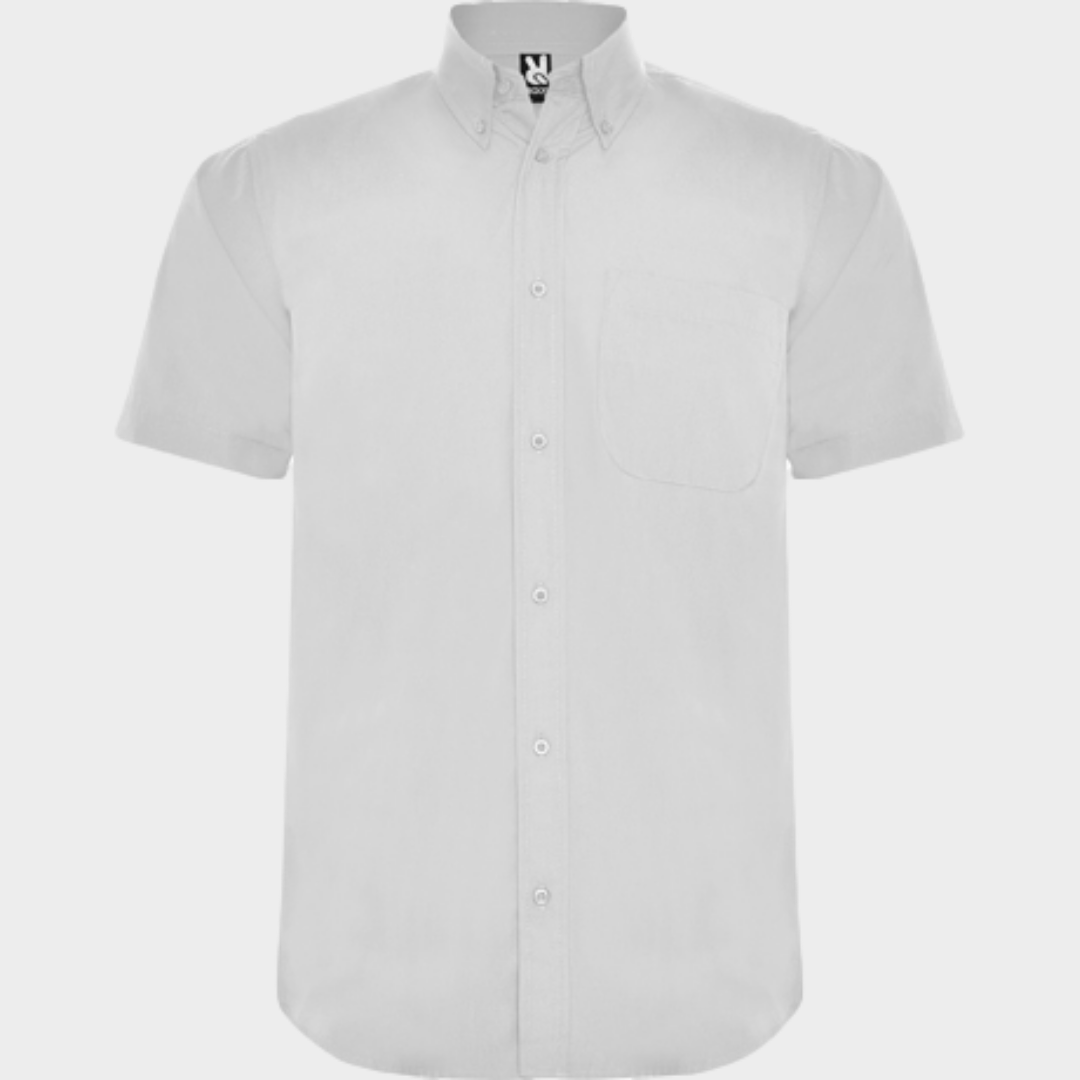 Camisa de manga curta e colarinho clássico, estilo engomado de 1 botão.