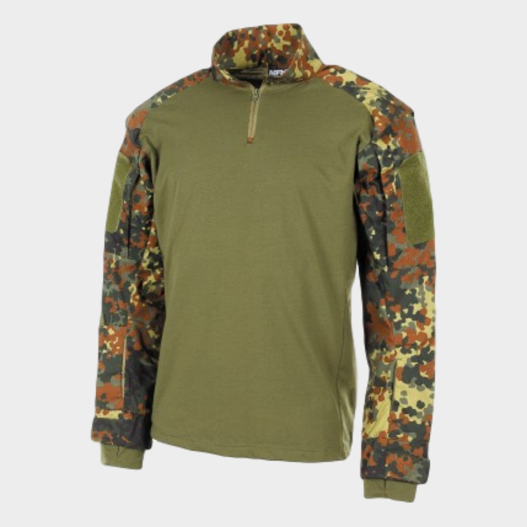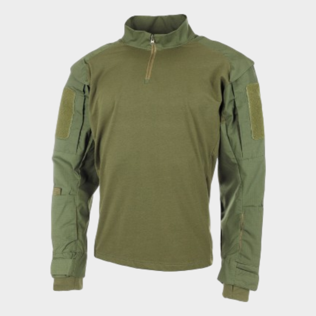 Fecho na gola, bolso superior com fecho oculto e painéis de velcro. Entrada para protetores de cotovelo. Com bolso de velcro nas axilas e fecho oculto com extra dois bolsos para caneta.