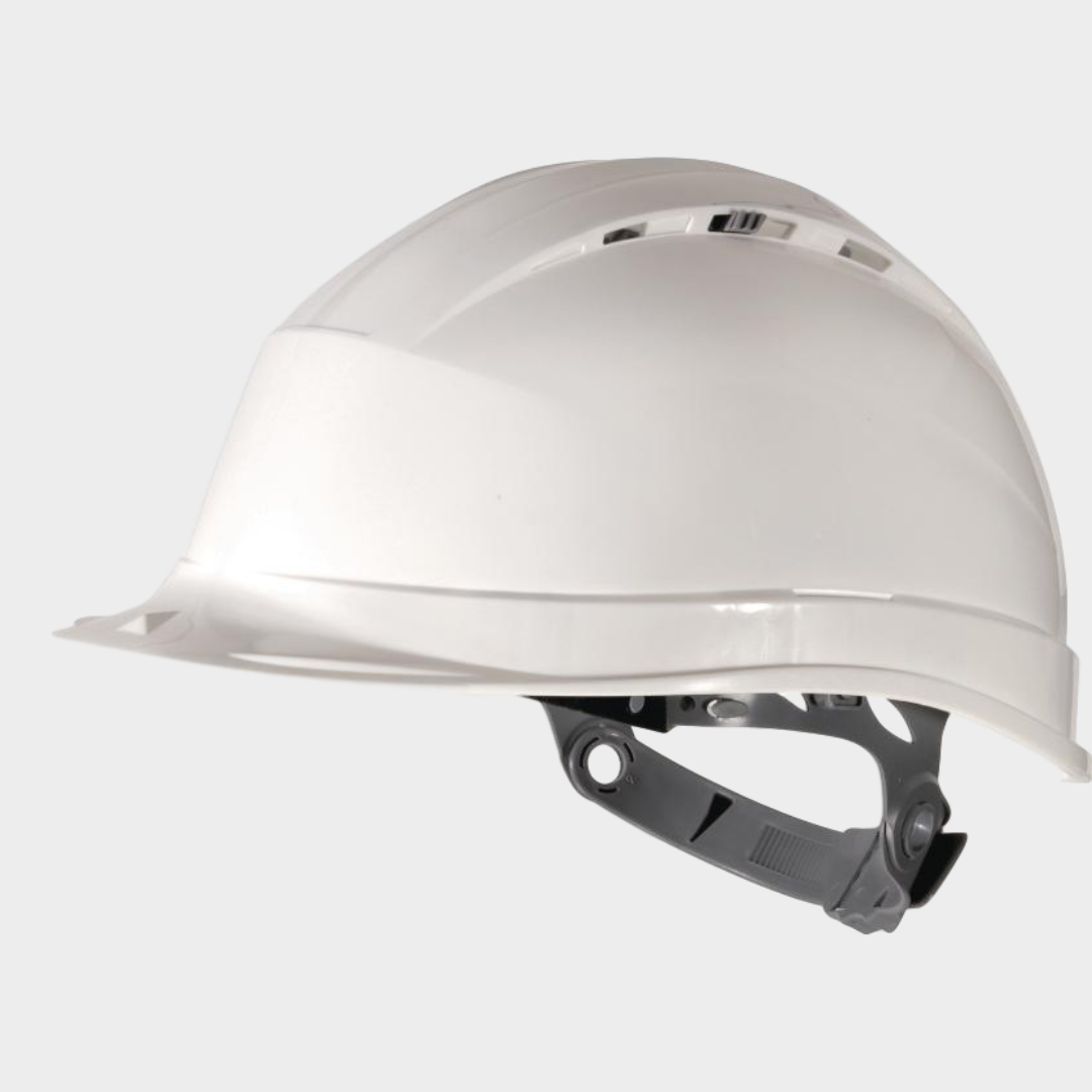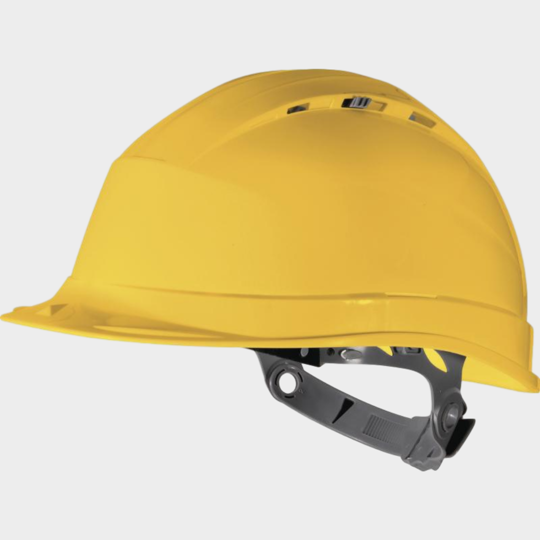 Capacete de estaleiro ventilado em polipropileno (PP) alta resistência tratamento anti-UV. Coifa polietileno BD em estrela com 8 pontos de fixação. Banda de suor em esponja. Aperto deslizante ajustável : perímetro da cabeça de 53 a 63 cm. 2 posições possiveis de perimetro da cabeça (alta / baixa) para um maior conforto. Capacete ventilado com ventilação ajustável.