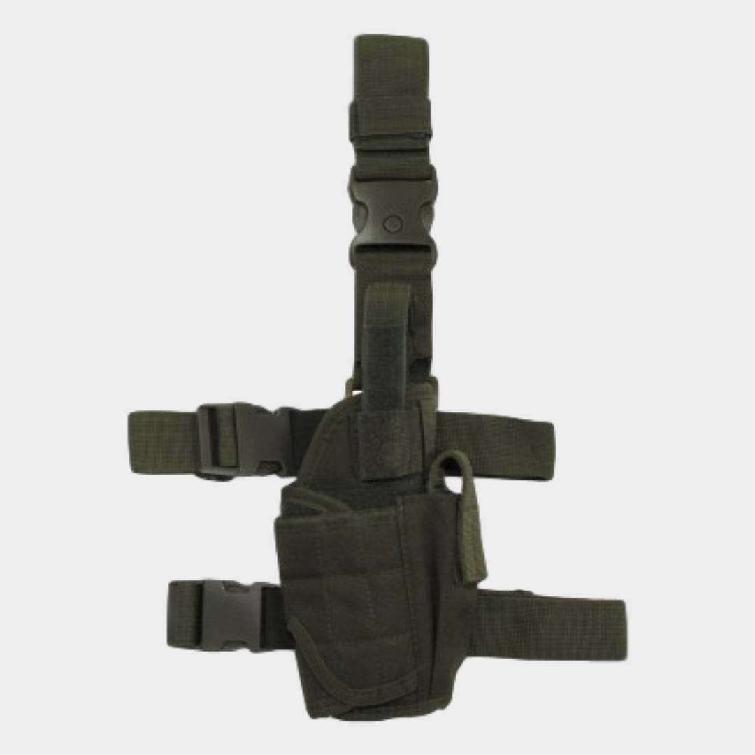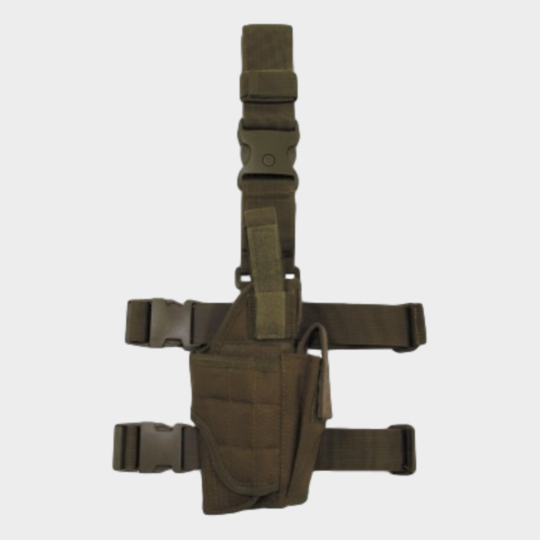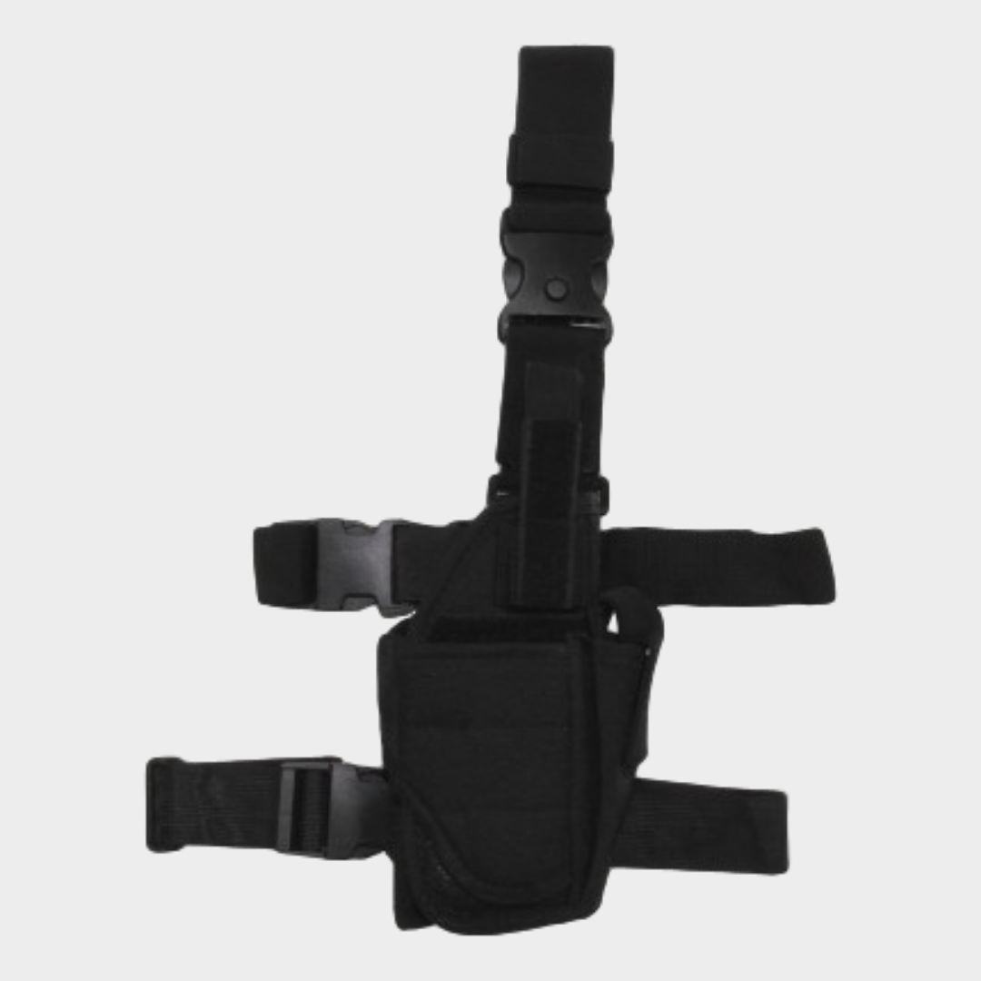 Coldre de perna com alças ajustáveis para uma melhor fixação fecho de clique para uma facil extração e fácil aplicação. Presilha para o cinto com adaptabilidade até 6cm/60mm. Incluido está tambèm uma bolsa para suporte de um carregador. Coldre adequado para destros.