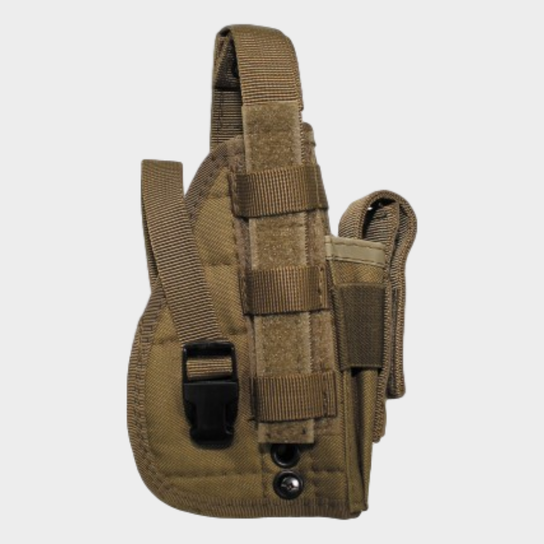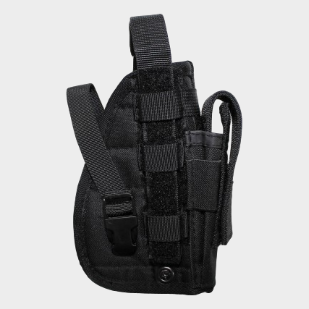 Coldre com sistema molle para destros com velcro ajustável e fecho de pressaõ com segurança adicional devido á presilha/alça ajustável, bolsa para carregador anexada.