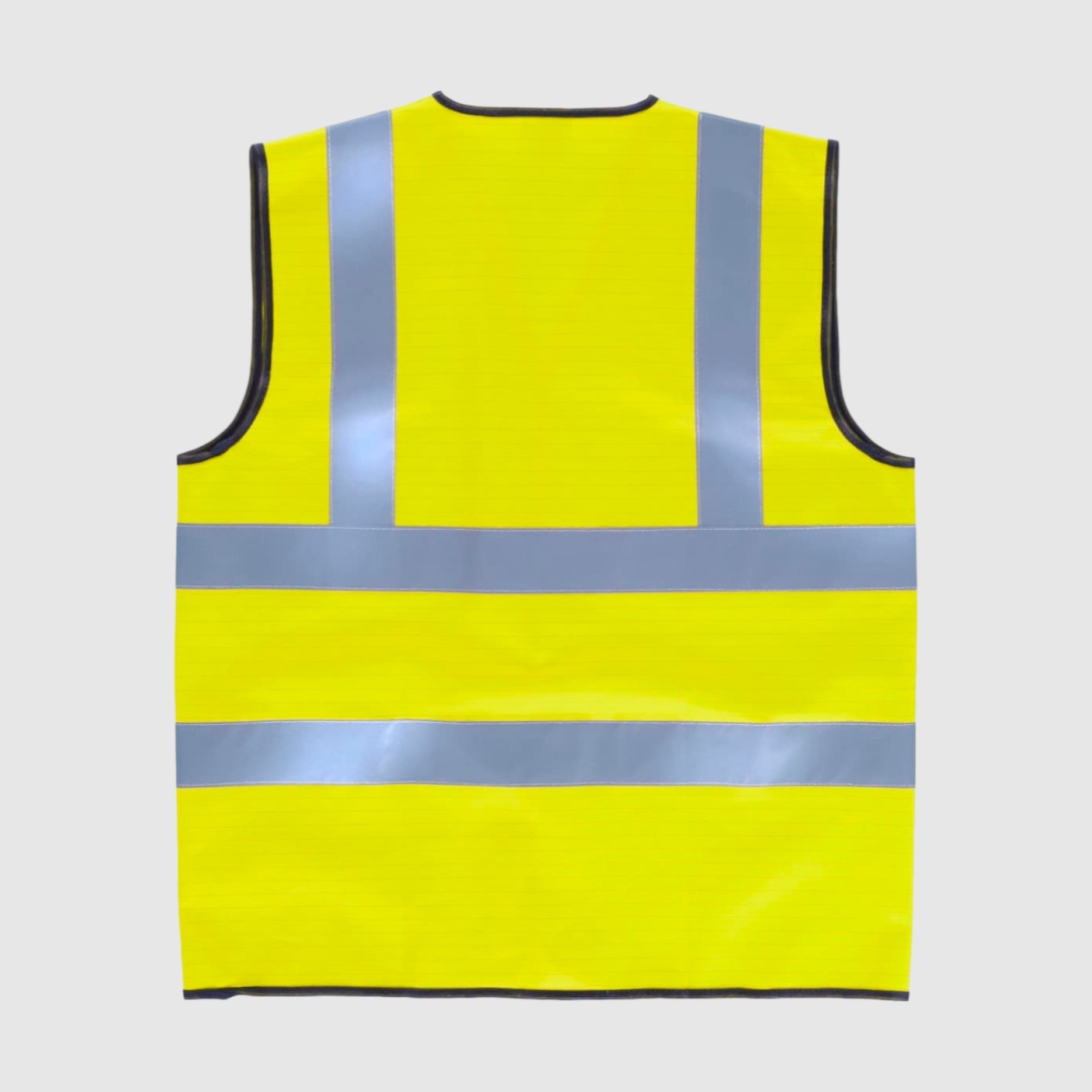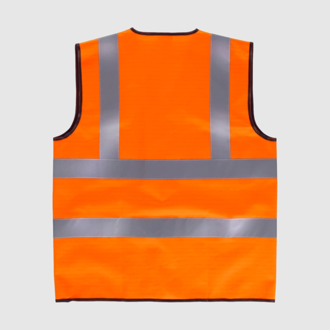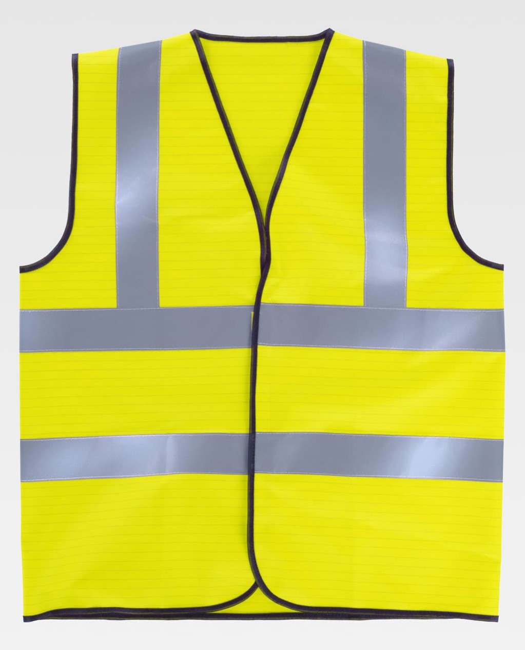 Colete Anti estático de alta visibilidade com faixas refletoras com decote em bico e fecho central de velcro ajustável. Faixa refletora nos ombros e duas no peito. A separação entre os fios condutores do tecido ajuda a dissipar a carga electroestatica acumulada evitando assim a formação de faíscas que podem iniciar um incêndio.