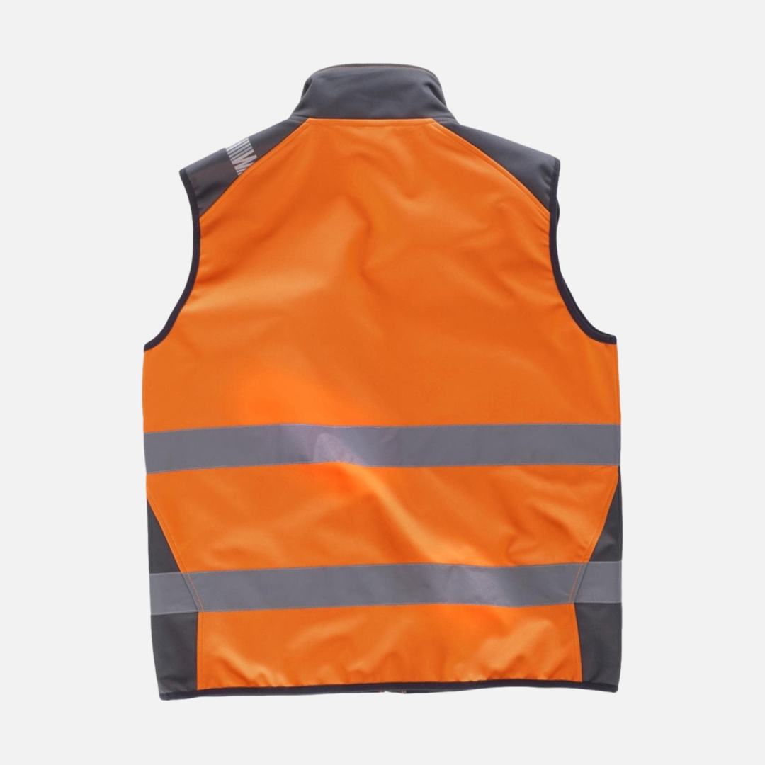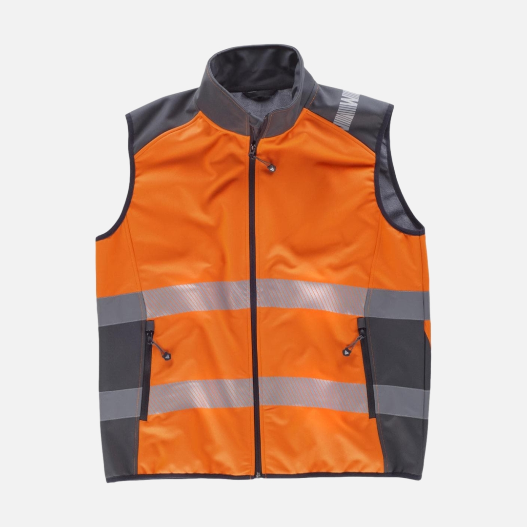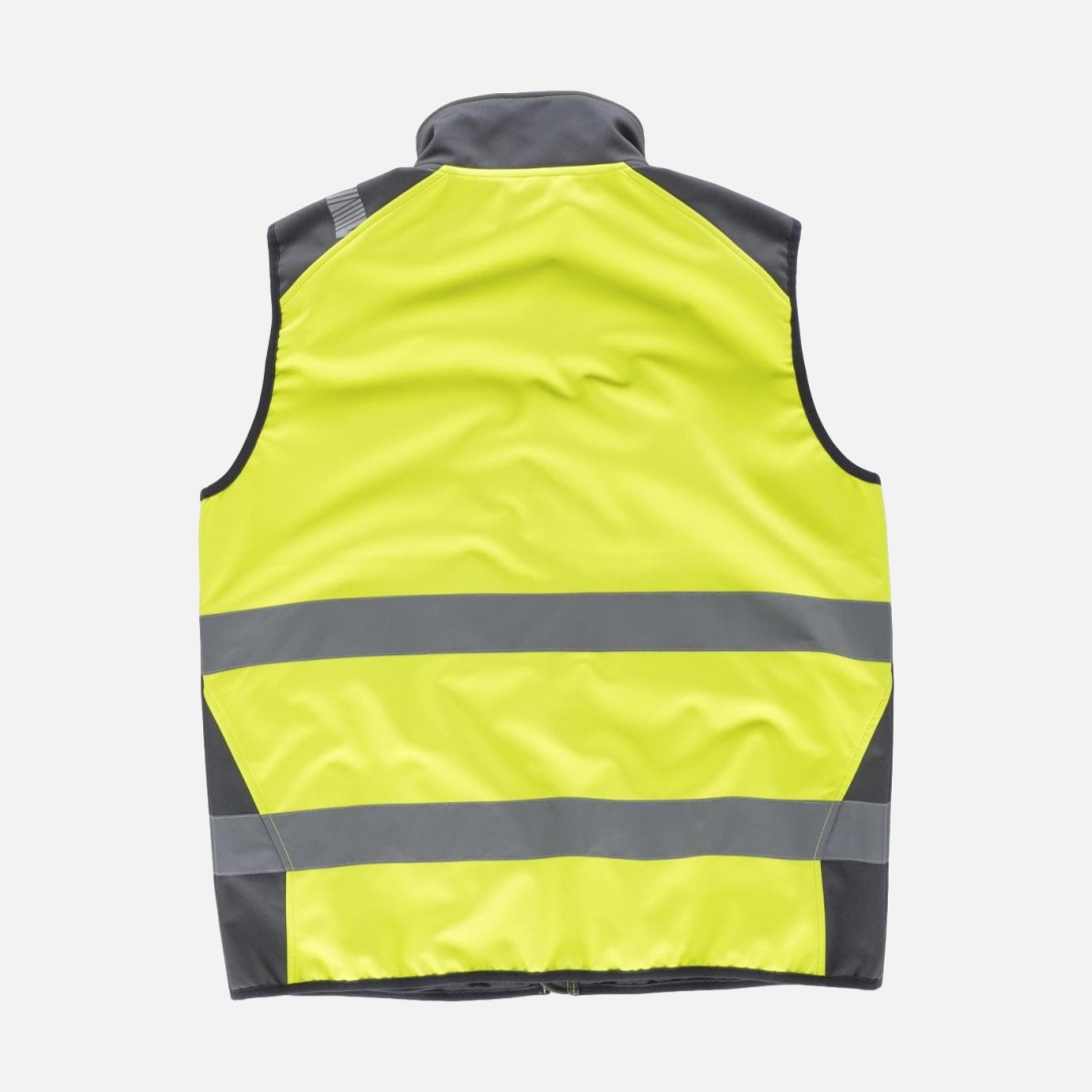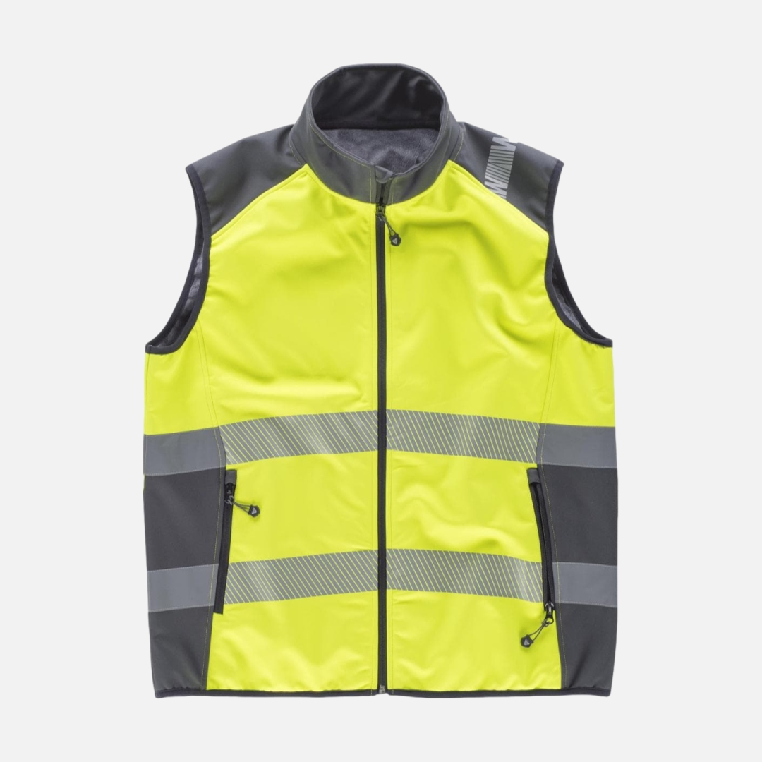 Colete WorkShell de alta visibilidade combinado nos ombros e laterais com faixas refletoras.