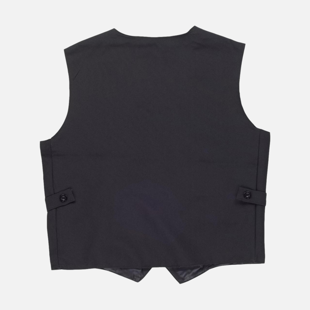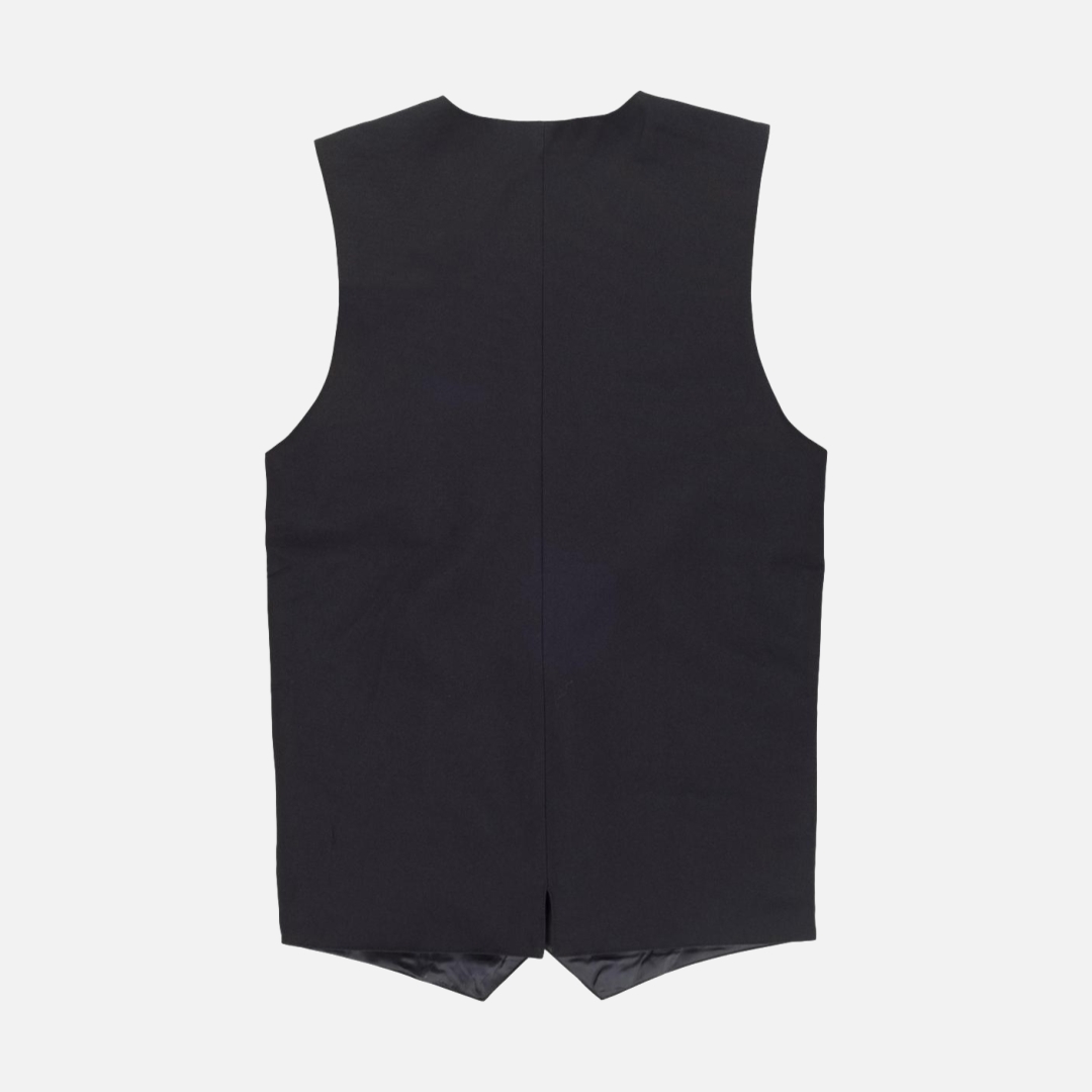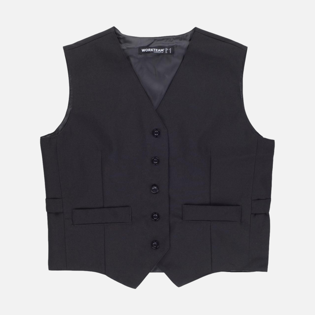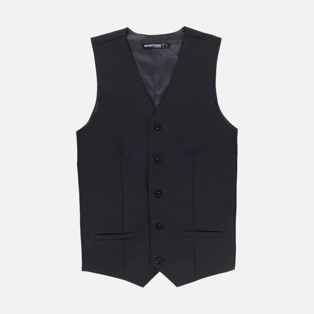 Colete com corte clássico. Decote em bico e fecho central simples com cinco botões do mesmo tom. Dois bolsos laterais semi-embutidos. Abertura nas costas. Acolchoado. A sua composição em 100% poliéster garante a estabilidade dimensional do vestuário.