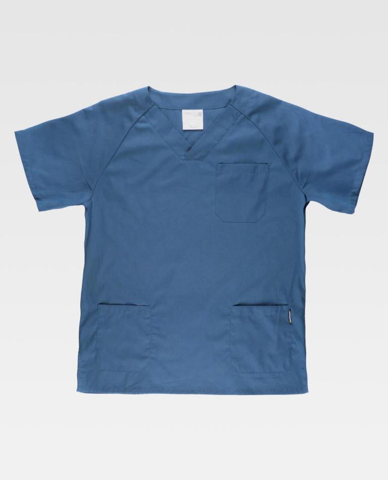 Tunica de manga curta com gola em bico. Aberturas laterais.