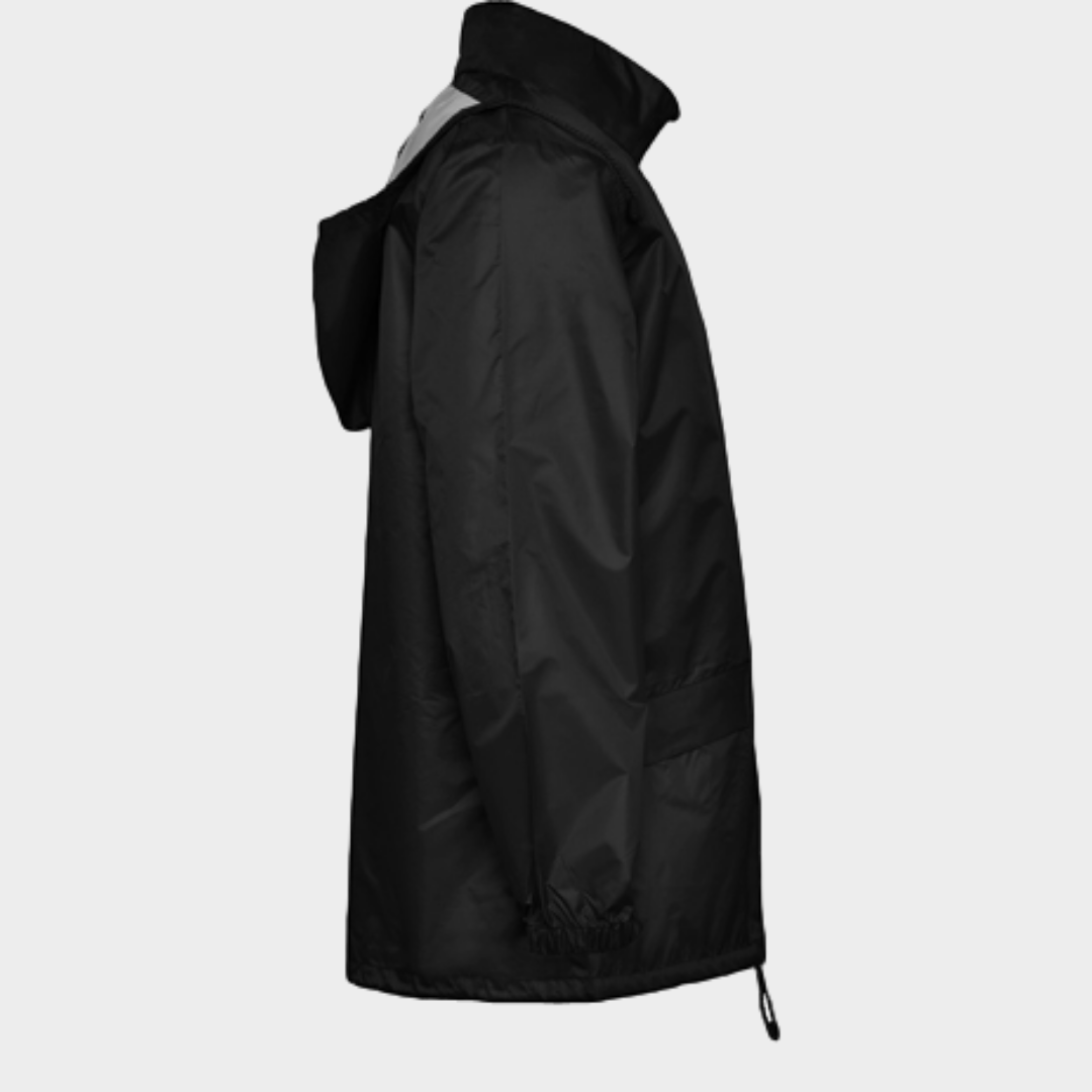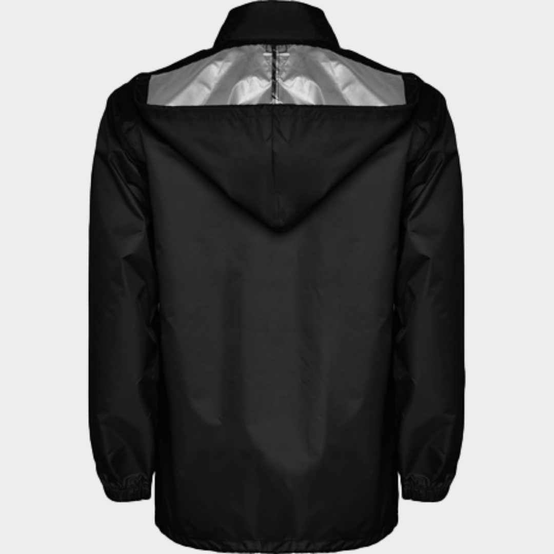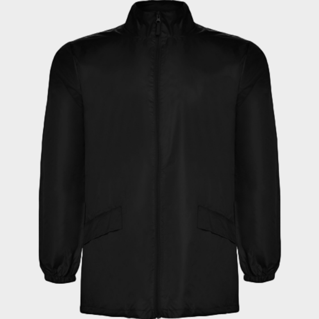 Casaco impermeável de gola alta com fecho completo. Baínha com cordões ajustáveis e carrapetas. Bolsa para o capuz com fecho na gola com cordões para uma melhor fixação do capuz. Dois bolsos com lapela. Punhos elásticos.