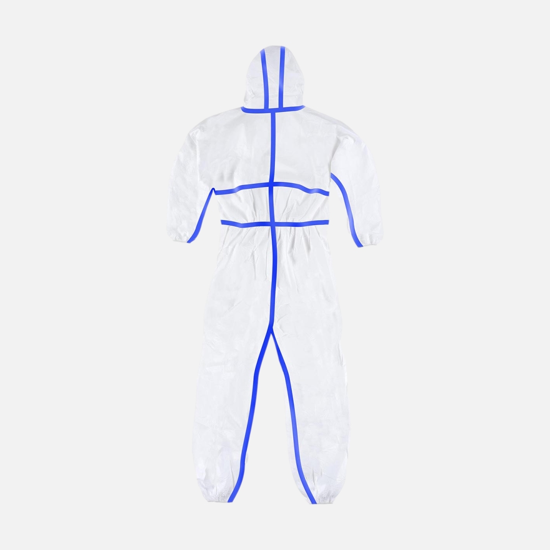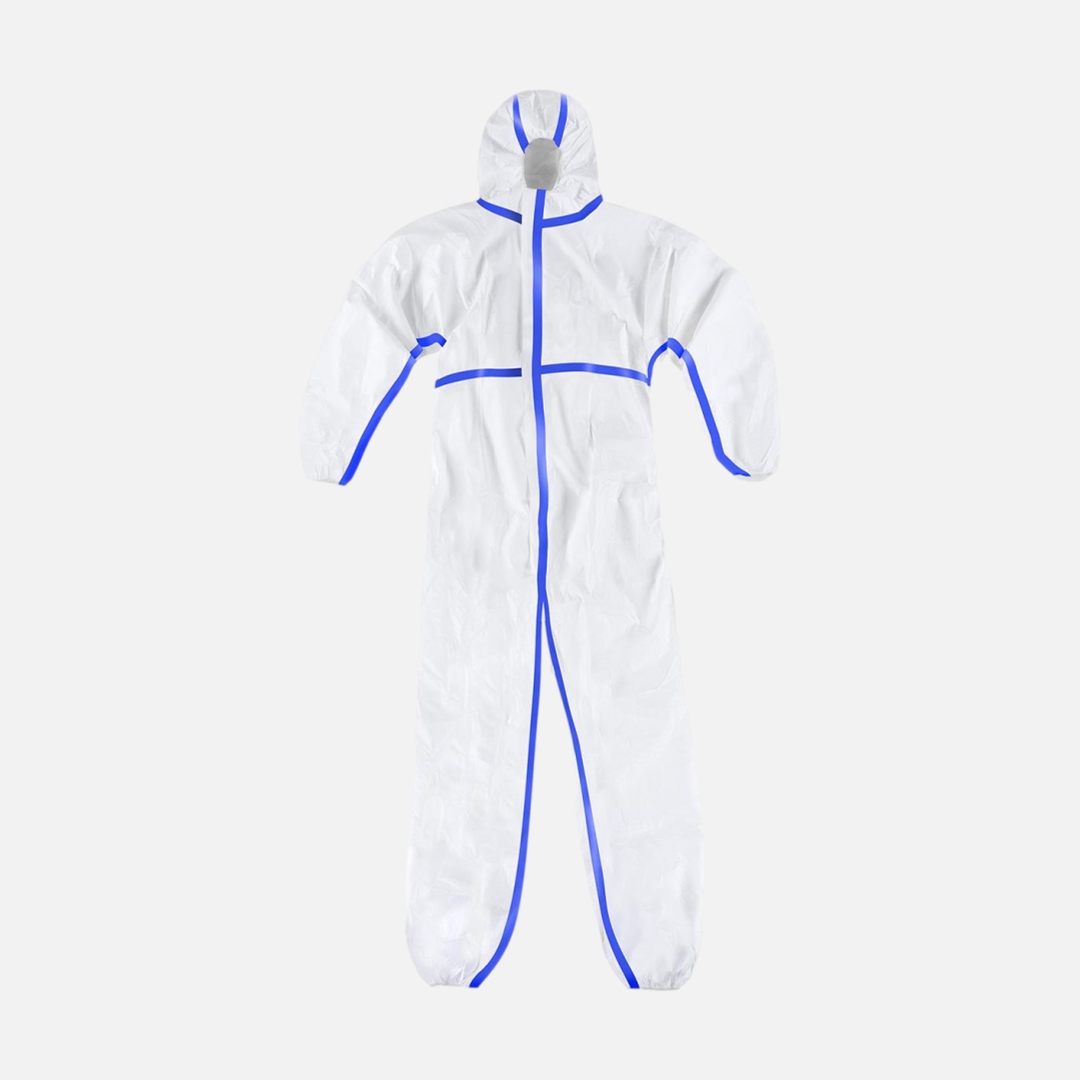 Fato-macaco com capuz. Elástico no capuz, pulso, parte trás da cintura e tornozelos. Aberto para o dedão. Cremalheira oculta por lapela e também com protecção no queixo. Costuras reforçadas e seladas com fita em contraste. Fabrico com uma camada fina de film plastificado microporoso não tecido. Protecção frente aos líquidos e partículas, aerossóis químicos herméticos e patogênicos transmitido por a sangue. Antiestático, baixa resistência térmica com alta eficiência na transmissão de vapor de água e boa transpirabilidade. Desenhado para oferecer uma protecção frente aos agentes biológicos infeciosos e partículas radioactivas. Costuras reforçadas com fita tecida interna para acrescentar a protecção frente aos líquidos e partículas. Baixo nível de borboto.