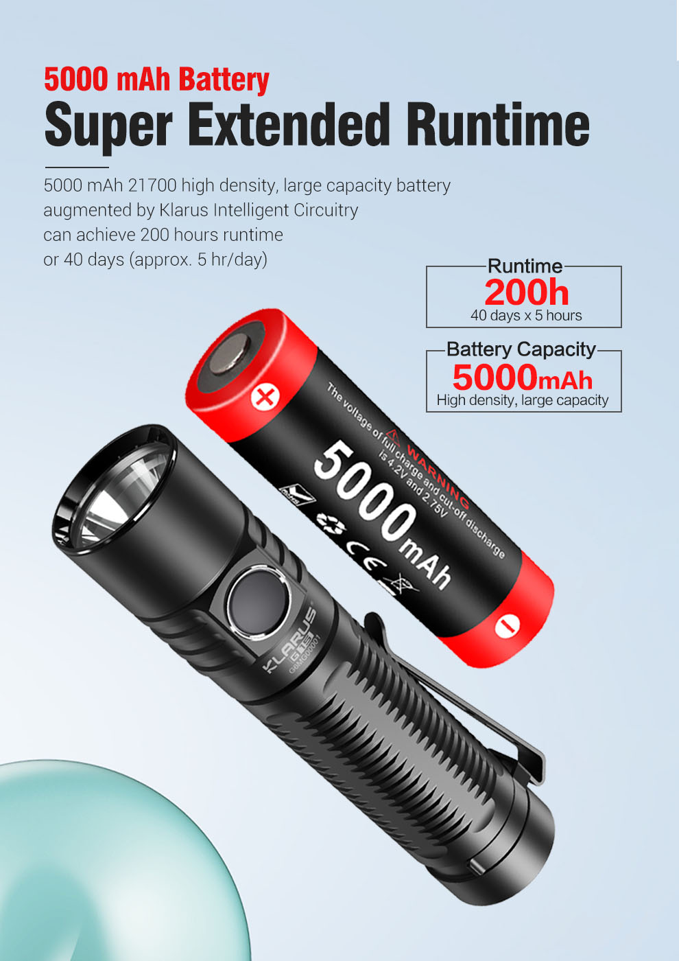 The flashlight is powered by a 5000mAh 21700 Li-ion battery, can support a maximum of 200 hours or 40 days(5 hours/day) runtime. With 2A high current USB charging port, 3Amp Wall Adapter & Offset Mount