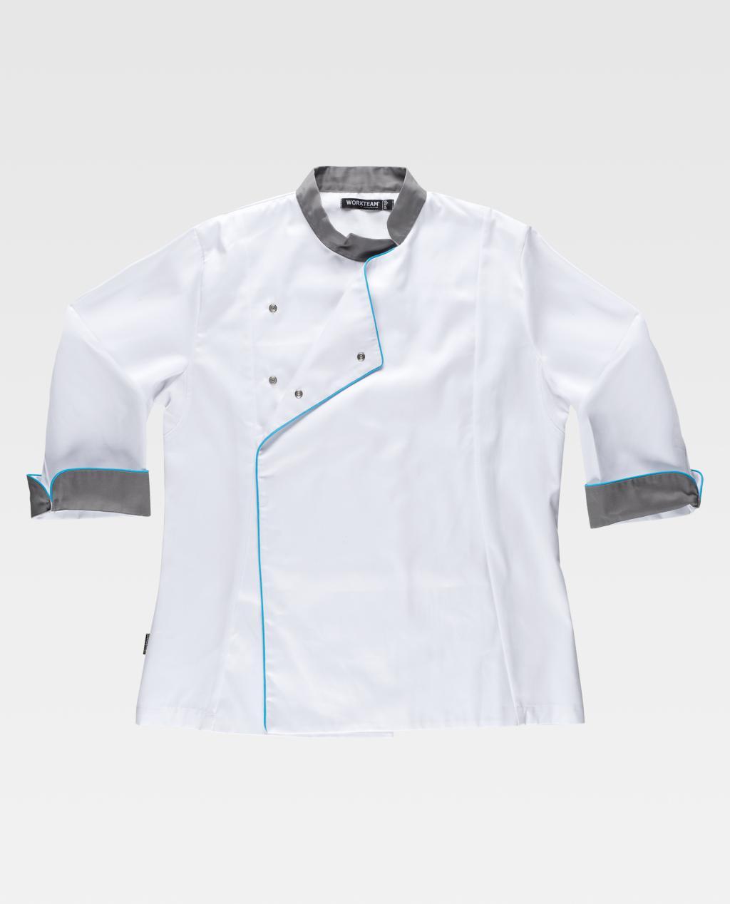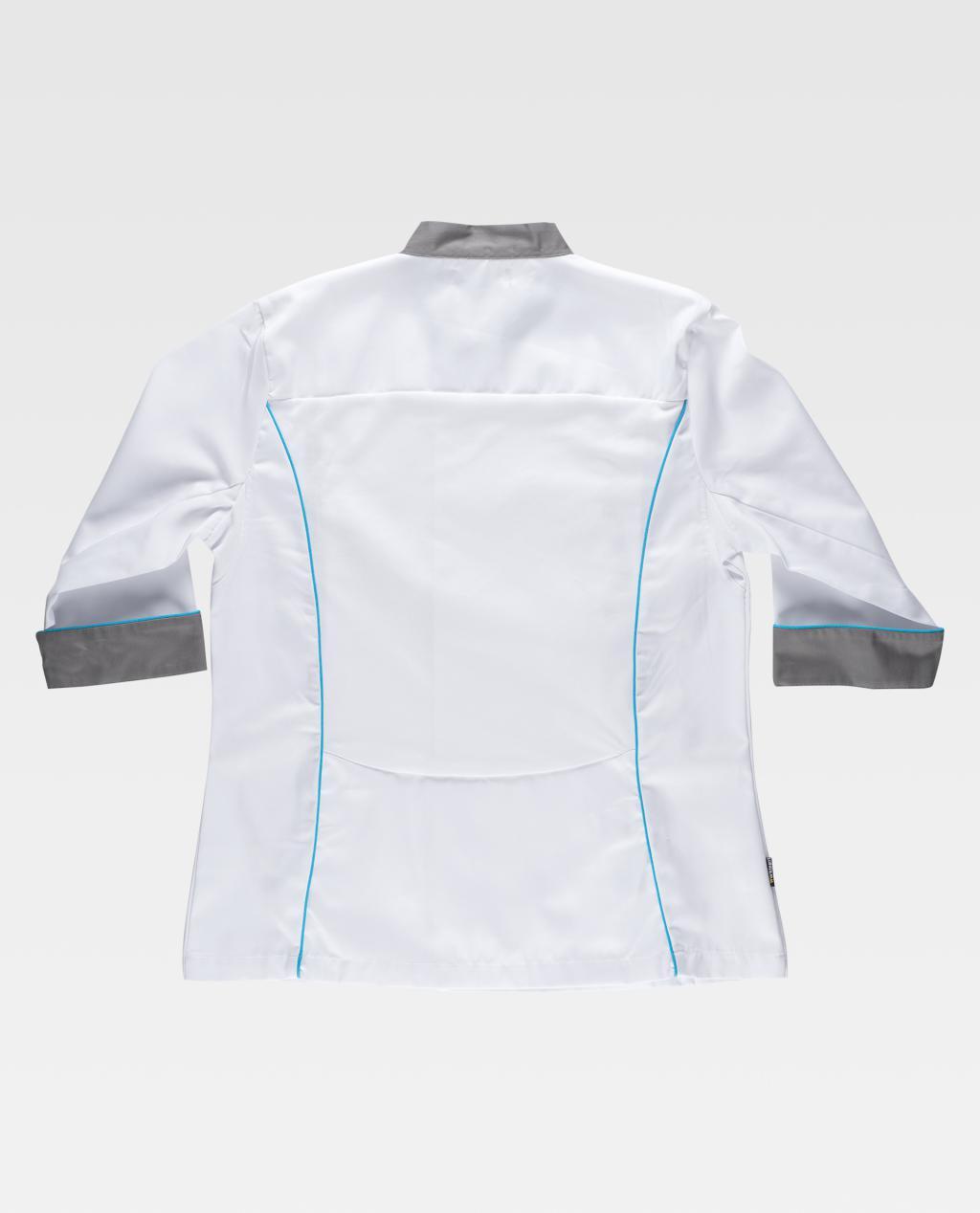Manga com punho virado. Gola e punhos combinados. Debruns em contraste na solapa, nos puños e nas costas.
