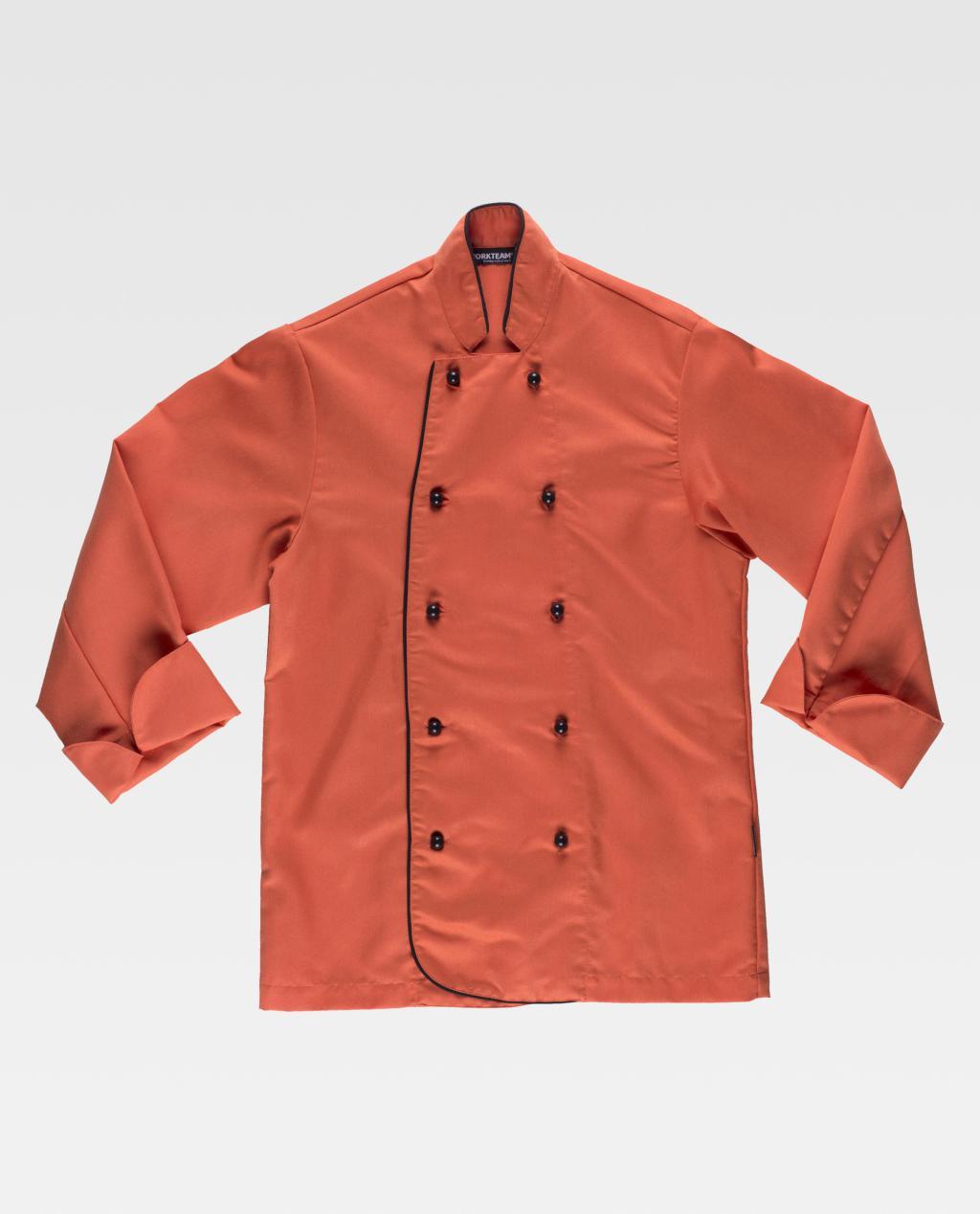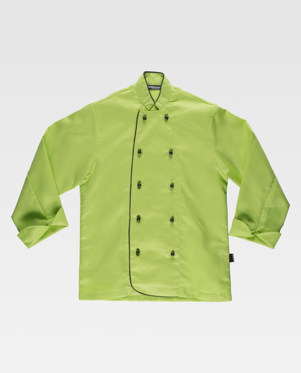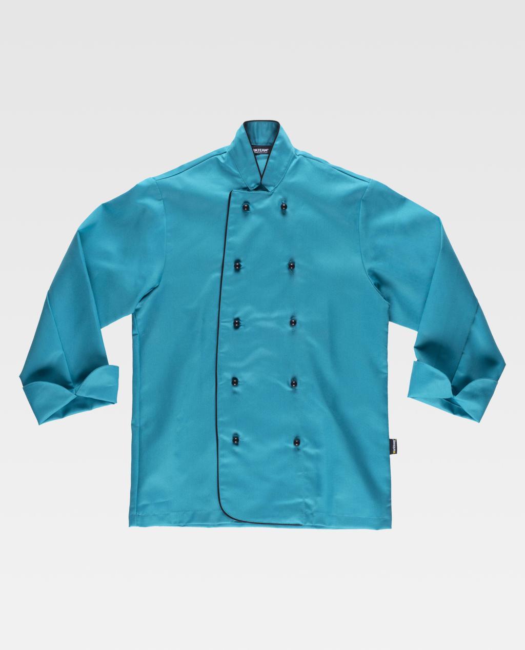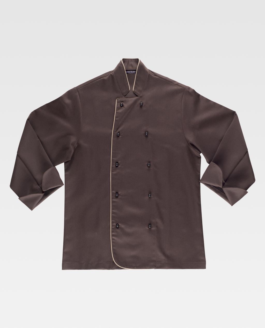 Jaqueta de cozinha unissex combinada. Gola Mao e aba cruzada com fecho de presilhas duplas ocultas.