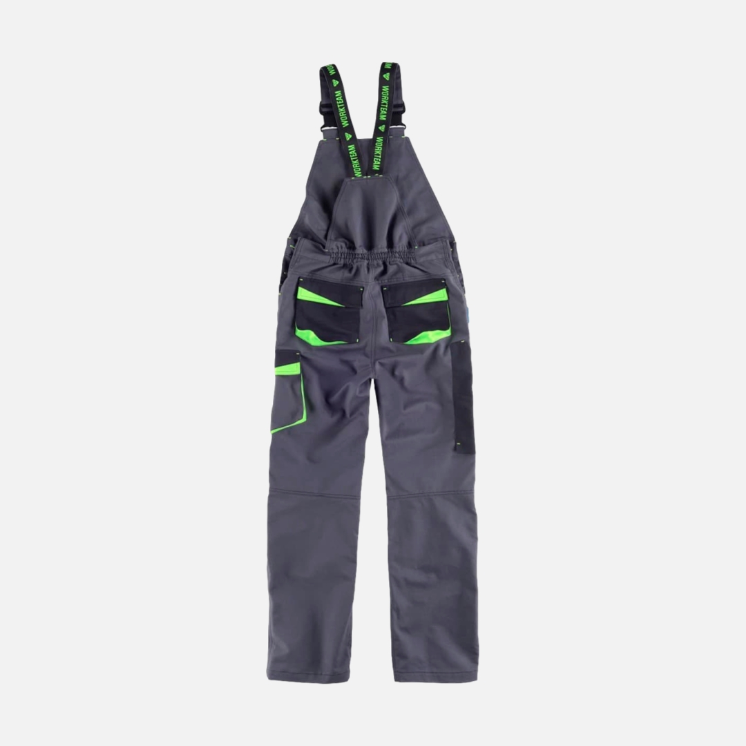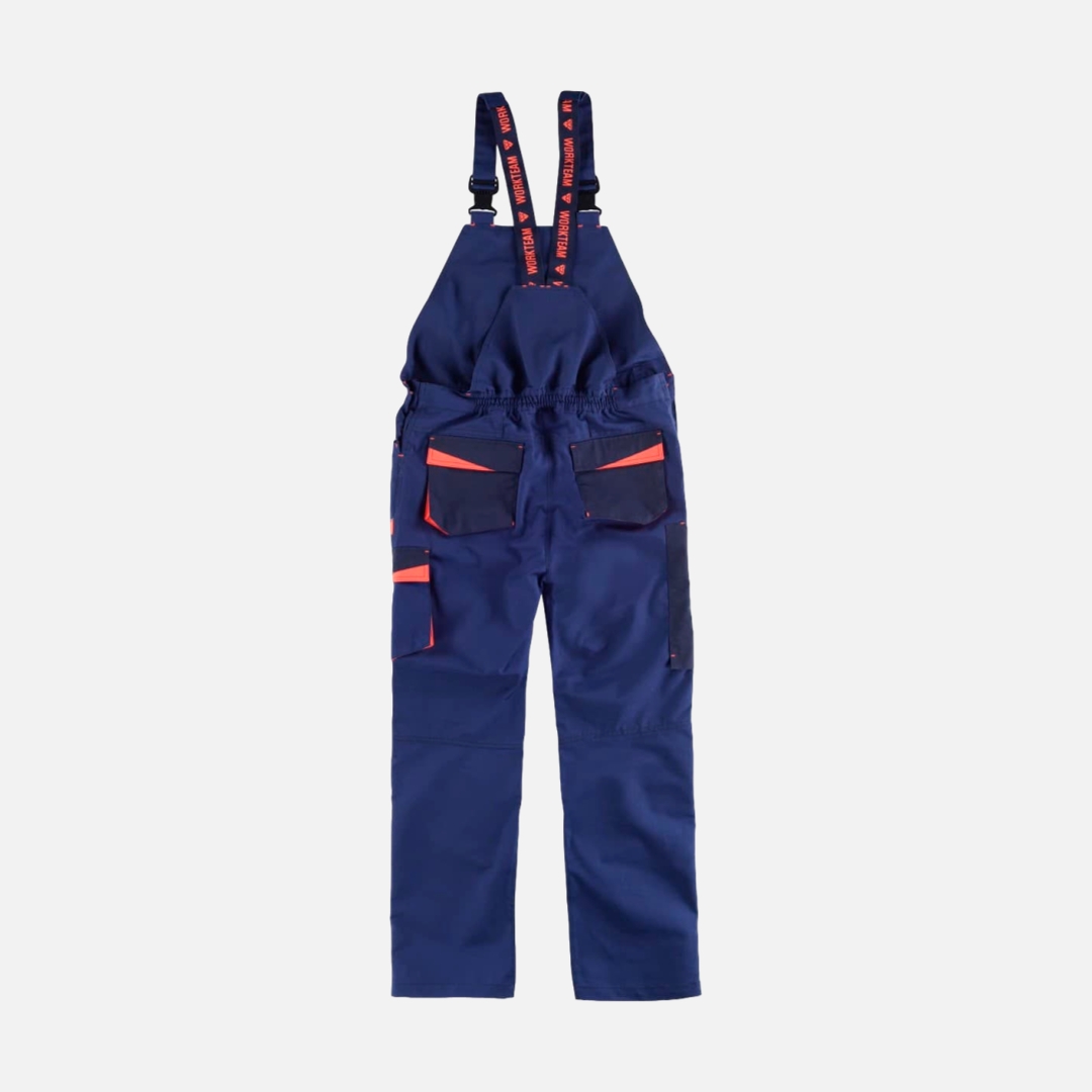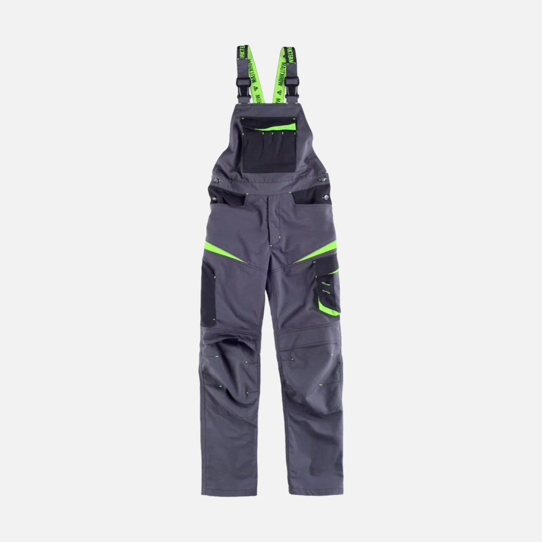 Jardineira com três core em tecido canvas, com as costas com suspensórios de elástico e fivelas automáticas. Com possibilidade de colocar joelheiras.