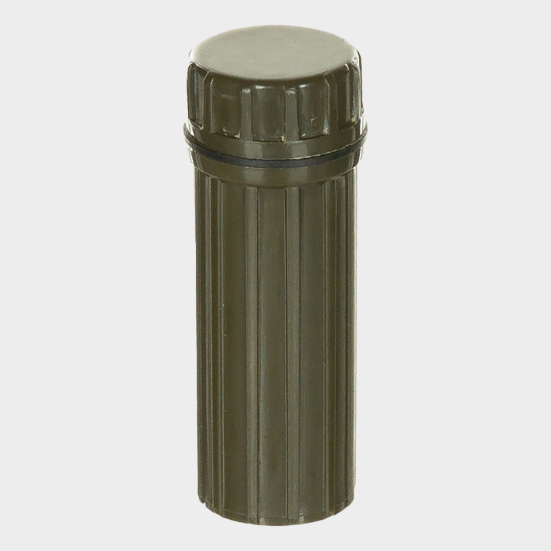 Caixa impermeável com fósforos, anzois e espelho.