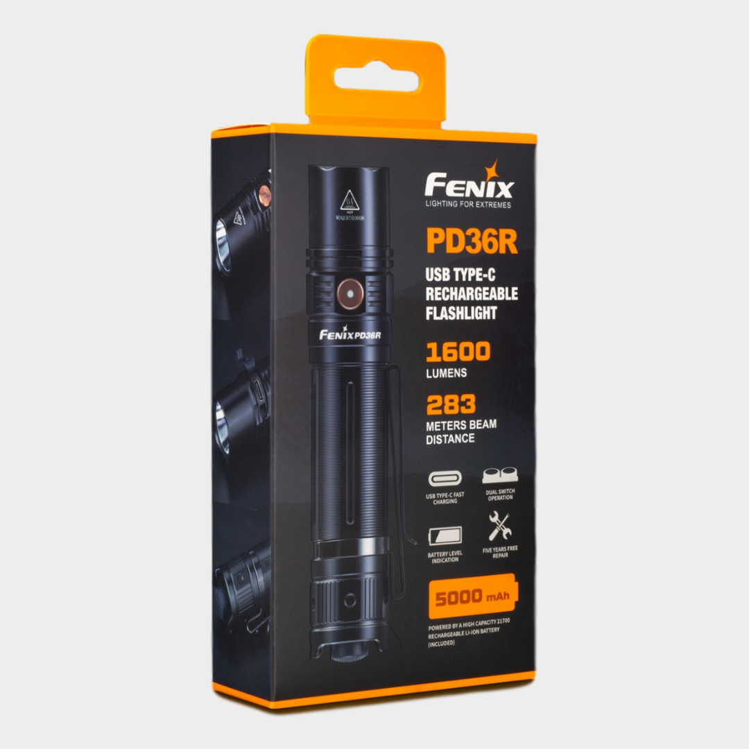 A PD36R é uma lanterna ultracompacta com uma poderosa porta de carregamento USB tipo C. Impulsionada por uma bateria recarregável de Li-ion de 21700 / 5000mAh de longa duração, a luz emite uma saída máxima de 1600 lúmens e 283 metros. Os comutadores duplos controlam cinco níveis de saída e estroboscópico para operação fácil e rápida. Os recursos adicionais incluem indicador de carga da bateria, memória de saída inteligente e clipe para o corpo em duas posições, tudo o que aprimora o uso diário em atividades ao ar livre e aplicações táticas.