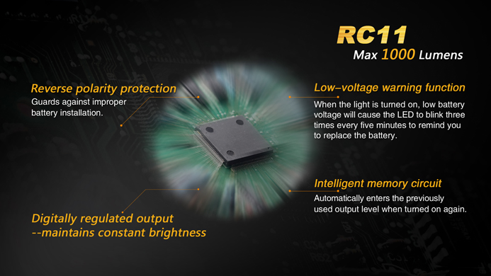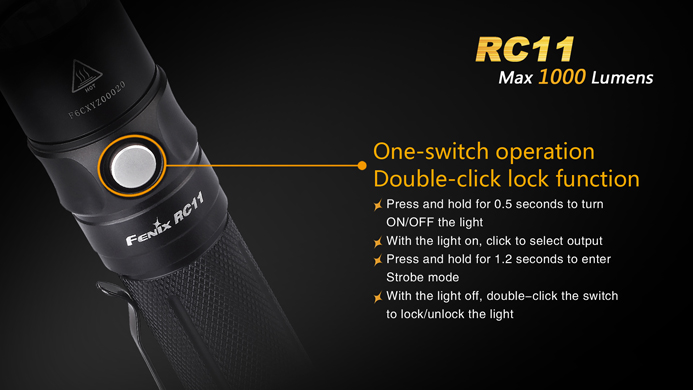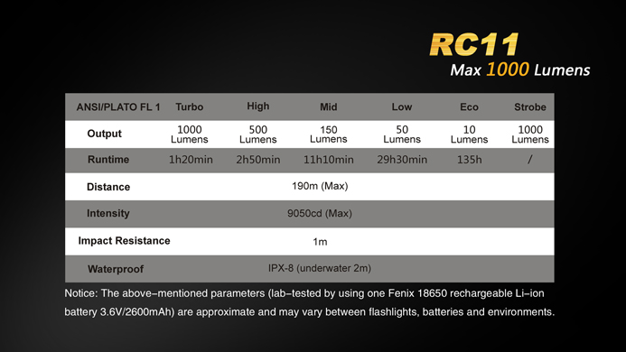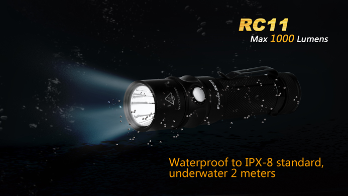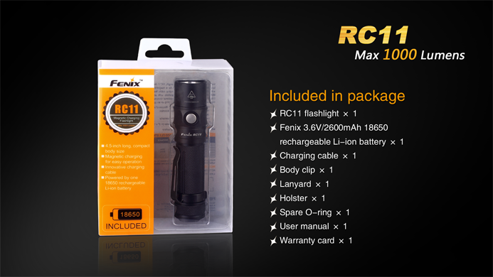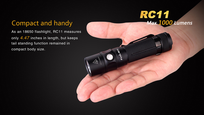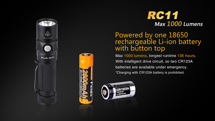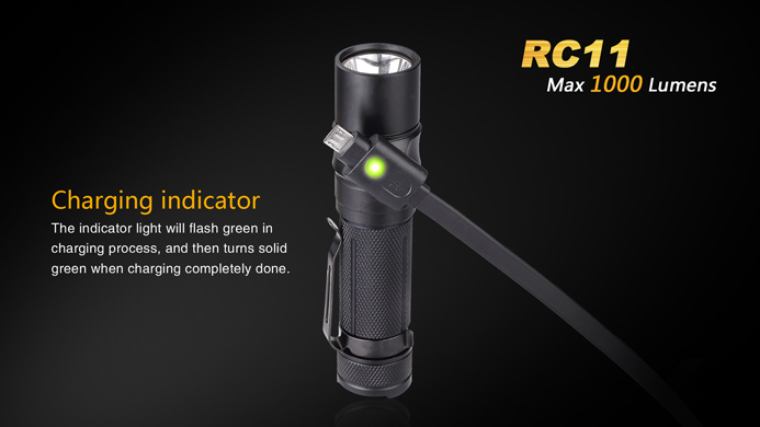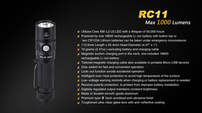 Medindo apenas 4,5 polegadas de comprimento, RC11 oferece saída máxima de 1000 lúmens e duração máxima de até 135 horas. Como lanterna de carregamento magnético, é equipada com um inovador cabo de carregamento de dupla finalidade, com porta de carregamento magnético e porta de carregamento Micro USB. Compatível com uma bateria de íon de lítio 18650, a bateria de lítio CR123A está disponível em circunstâncias excepcionais. Além disso, a tampa traseira plana oferece capacidade conveniente de suporte para uso como um holofote voltado para cima.