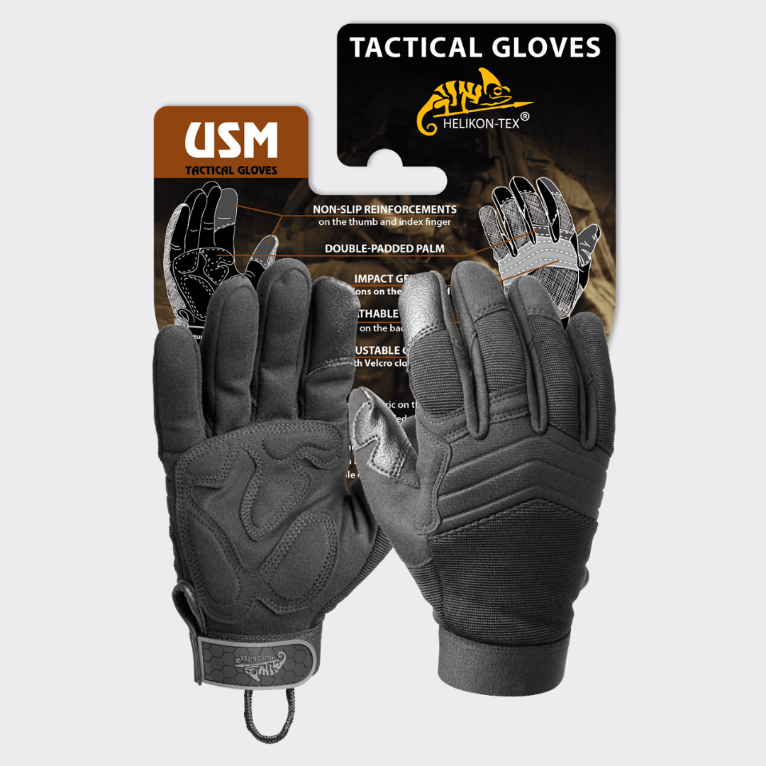 As luvas modelo USM são luvas táticas universais para tarefas diárias. Eles protegem as mãos e fornecem um aperto firme durante o manuseio da arma. As almofadas Impact Gel oferecem proteção adicional contra danos causados por golpes ou abrasão.