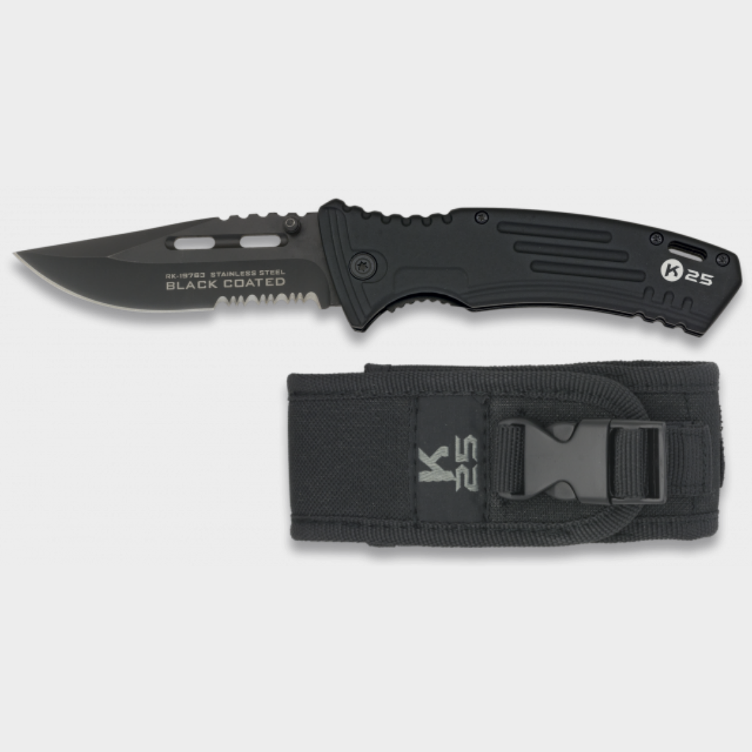 Navalha K25 Preta Coated SKU: 19763 Outdoor › Navalhas 25,00 € IVA incluído Partilhar Quantidade Comprar Contactar Descrição: Direitos autoraisDesenhado em EspanhaCabo: Alumínio - Revestido com BorrachaLâmina: aço inoxidável - revestido de pretoTamanho da lâmina: 9 cmEspessura da lâmina: 2,7 mmBolsa de nylon Marca K25