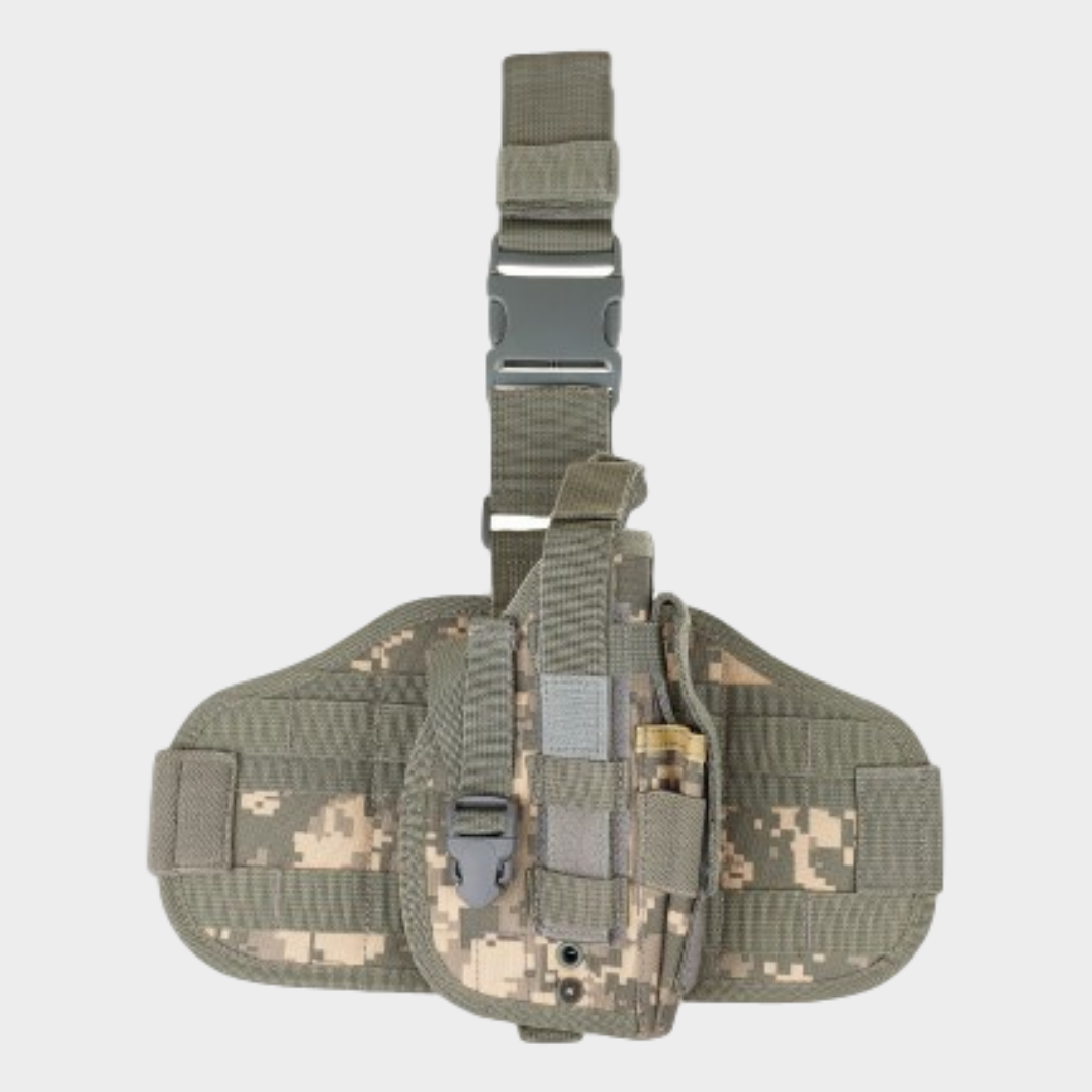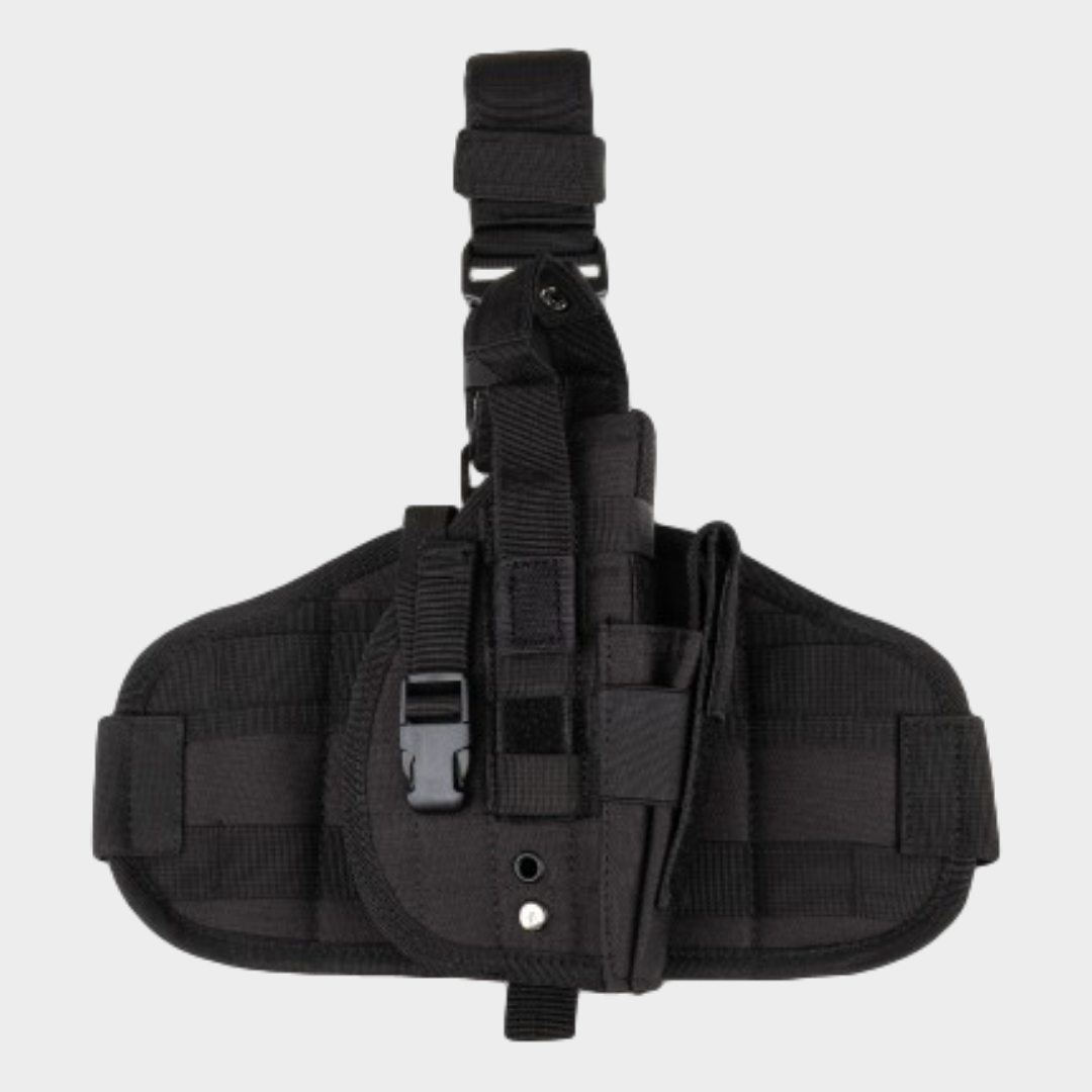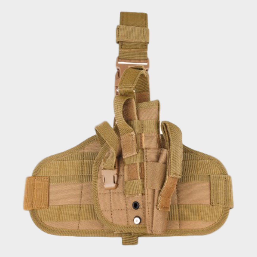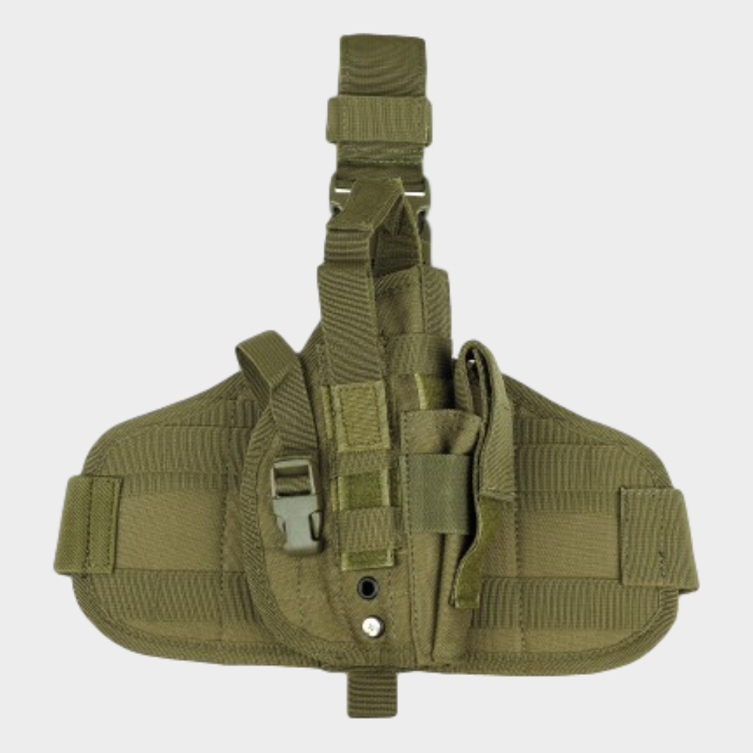 Plataforma molle com coldre de perna incluido, possibilidade de adicionar mais artigos na plataforma, como por exemplo porta carregadores, porta lanternas etc. Fivela reguladora para prender no cinto ou cinturão(até 6cm/60mm) com fivela de clique para facilitar a extração da ligação entre cinto e plataforma.
