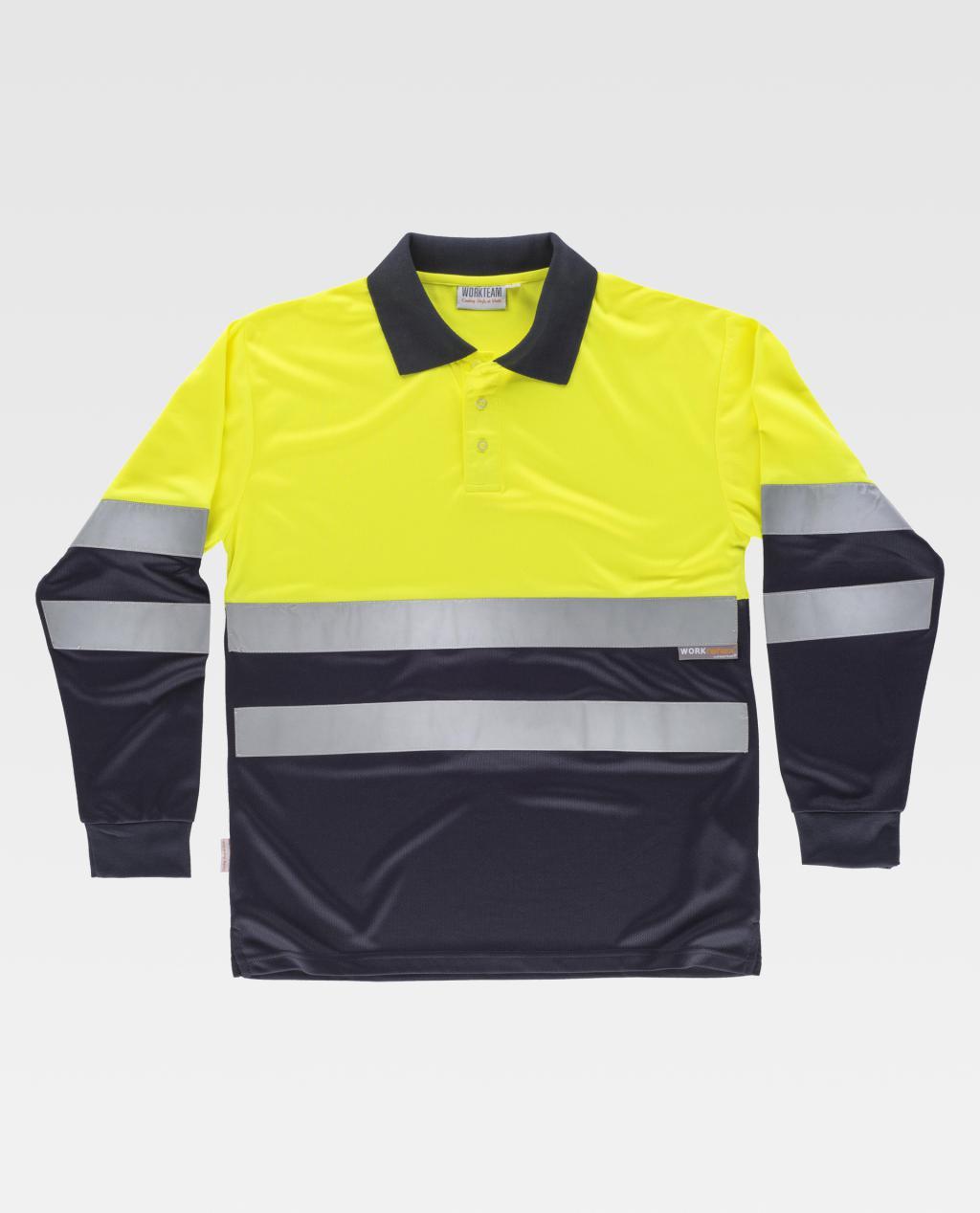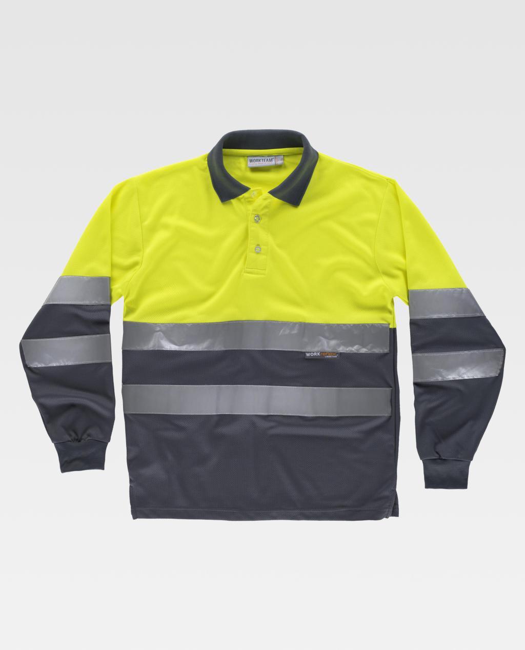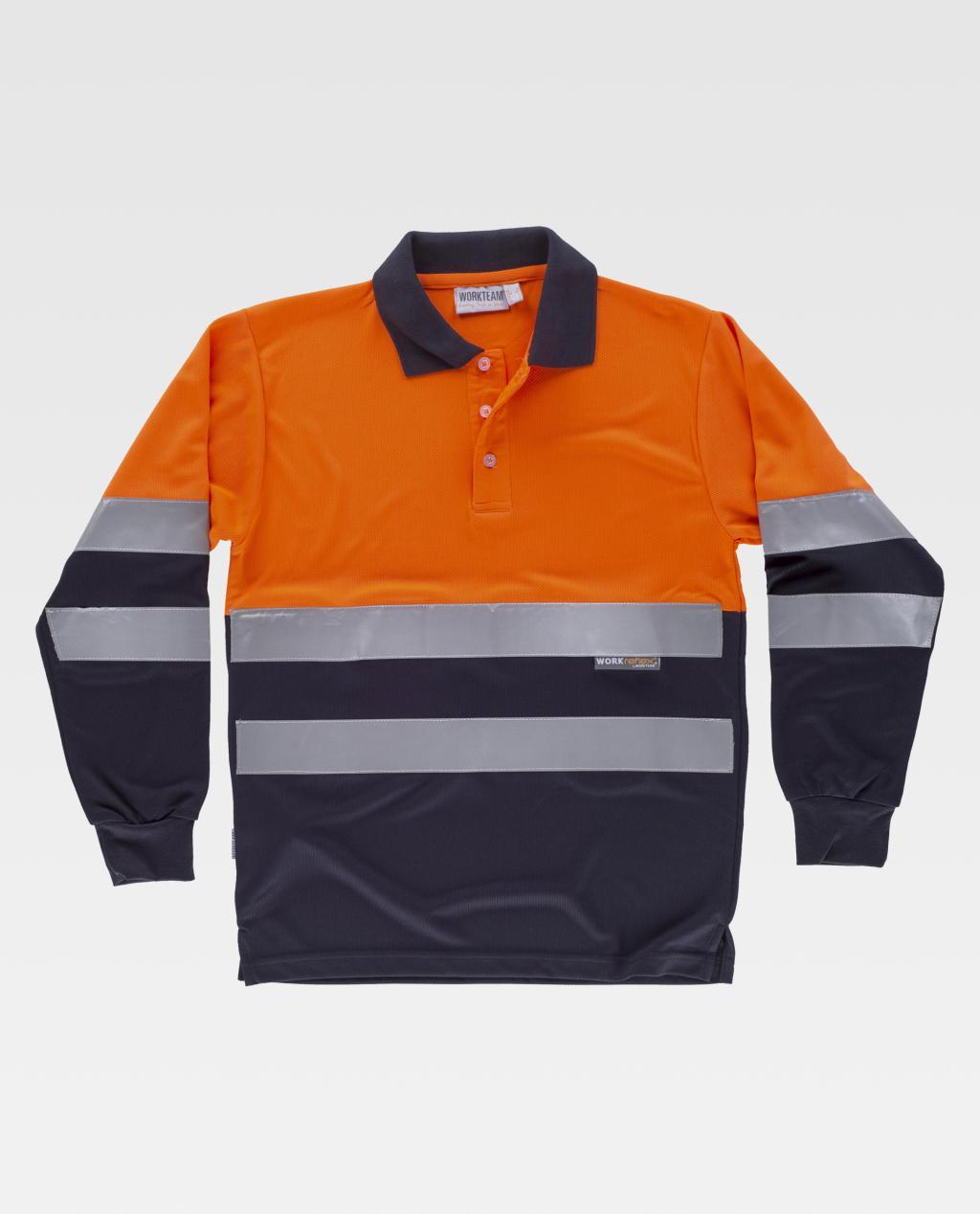 Polo combinado de manga comprida em poliéster bird's eye com faixas refletoras.