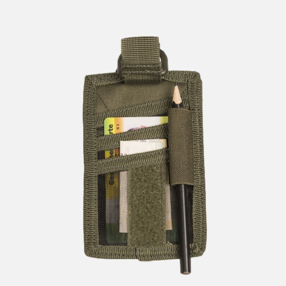 Porta identificação úsavel sob as roupas de serviço, com parte frontal plastificada e parte traseira porta documentos, com três ranhuras para cartões e um porta canetas.