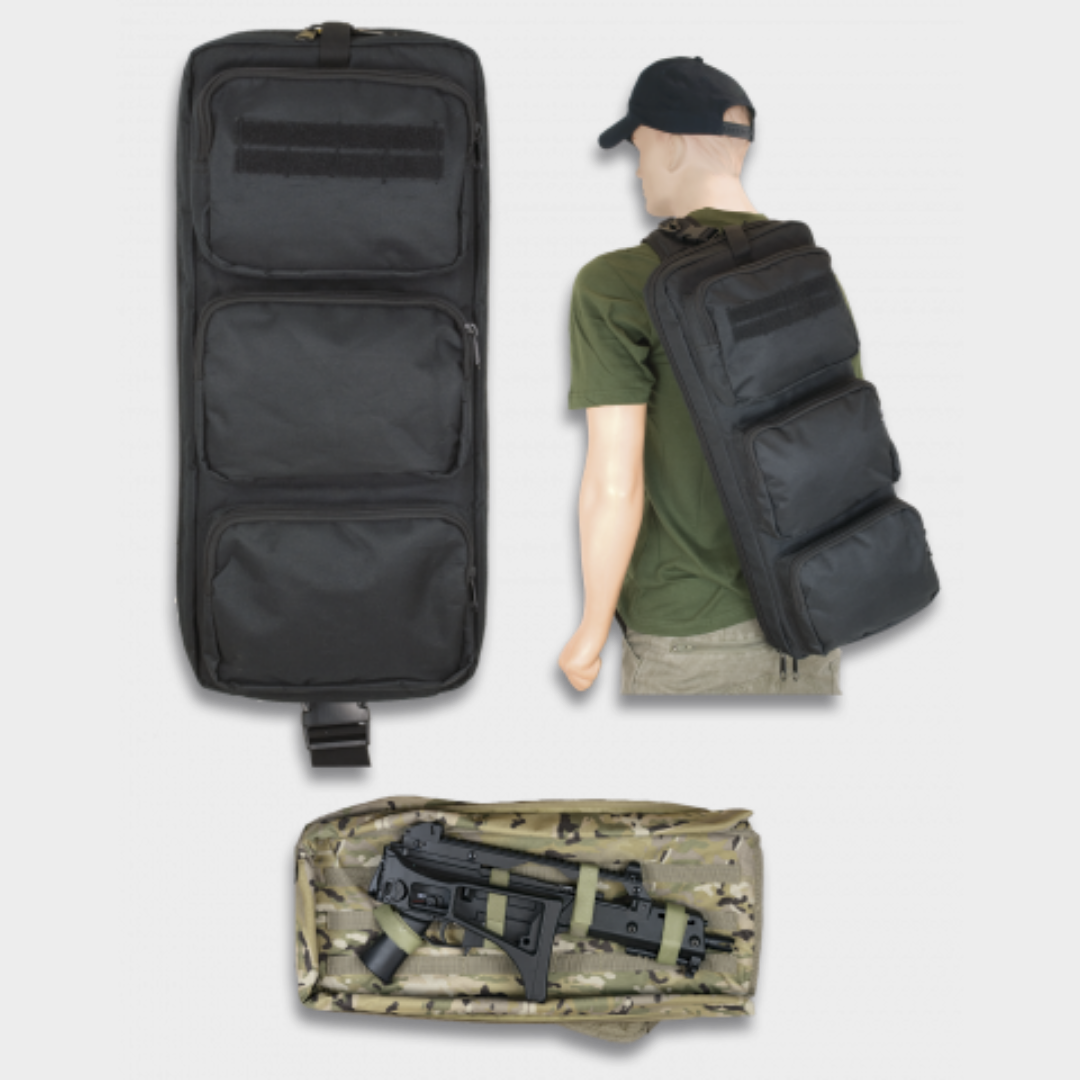 Saco de ombro porta-armas preta, com quatro compartimentos. Um bolso pricipal para a arma e três bolsos frontais para extra arrumação. Fecho em toda a volta do saco para uma abertura fácil e segura. Pode ainda ser adicionado alguns acoplamentos com bolsas de sistema MOLLE.