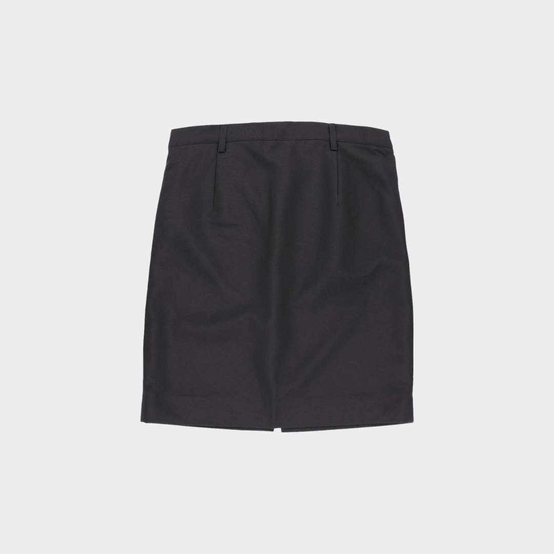 Saia curta simples com pregas, passadores e abertura nas costas.