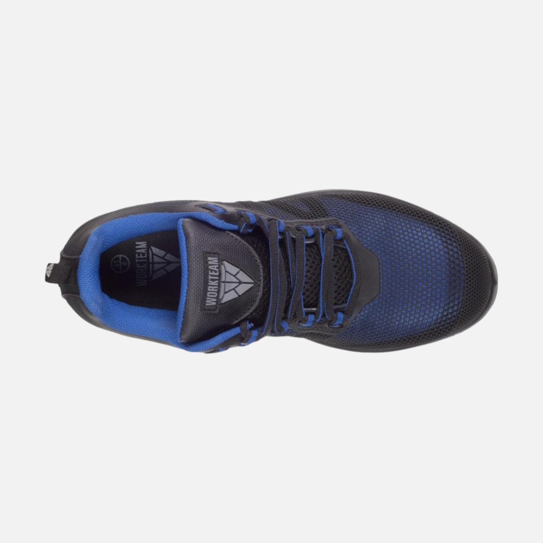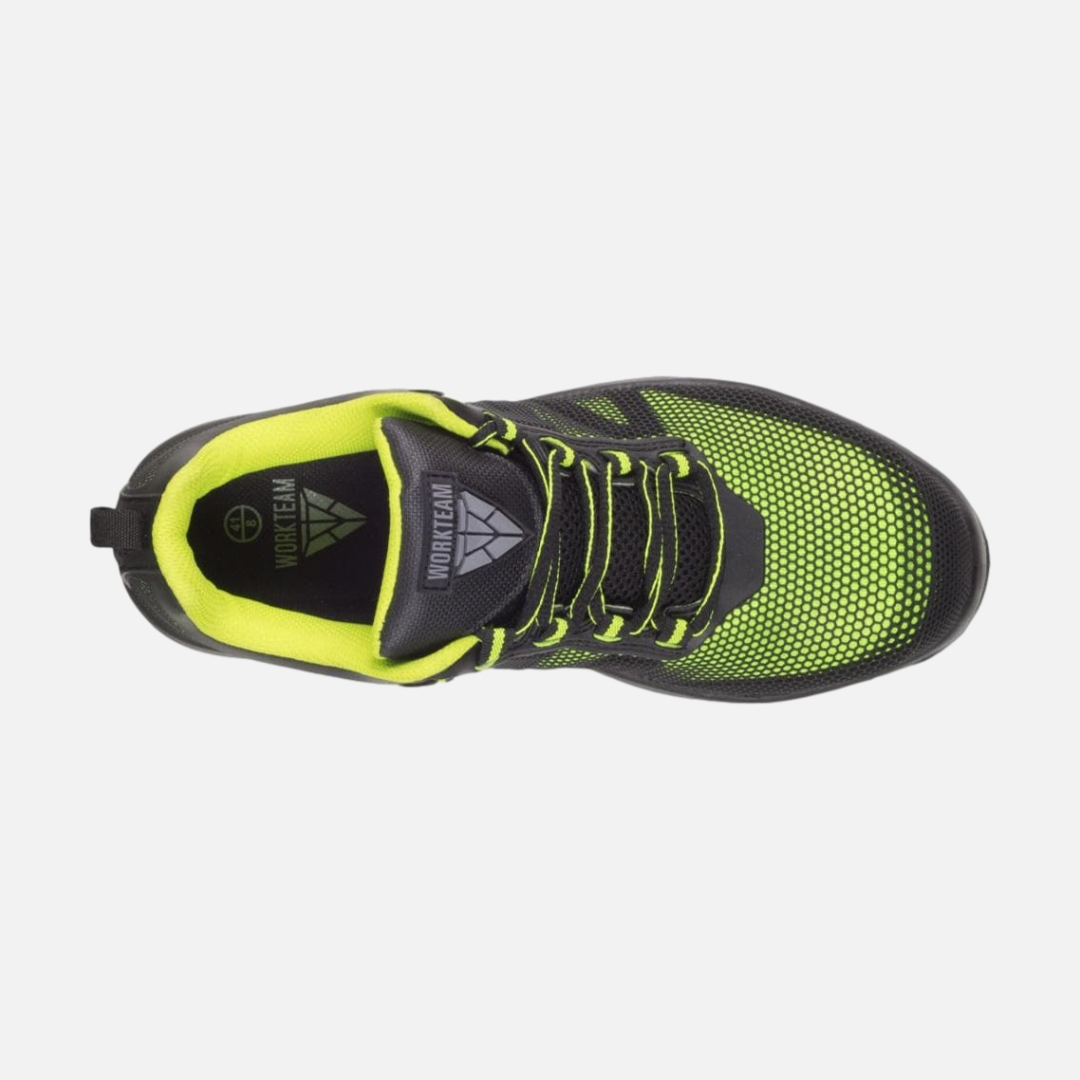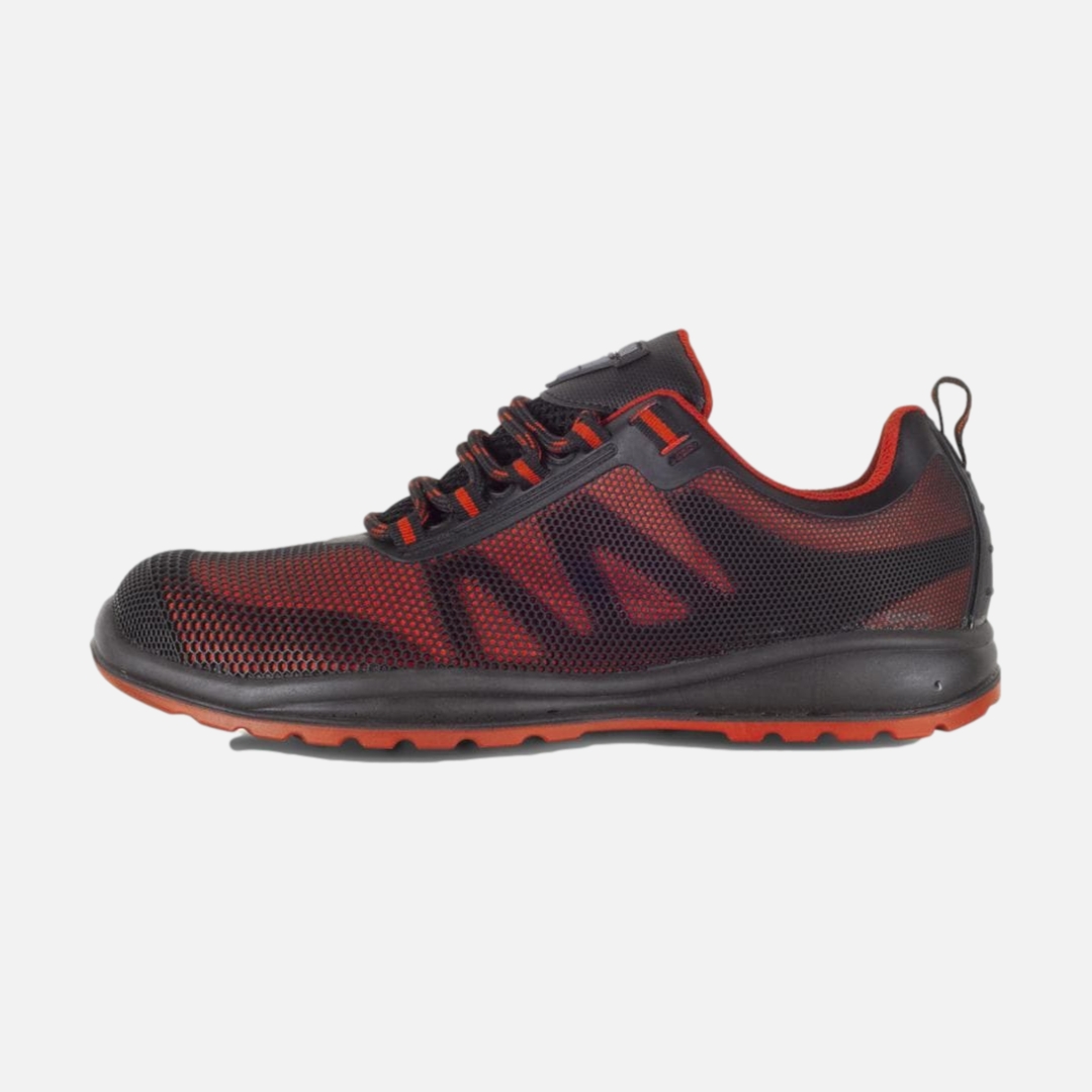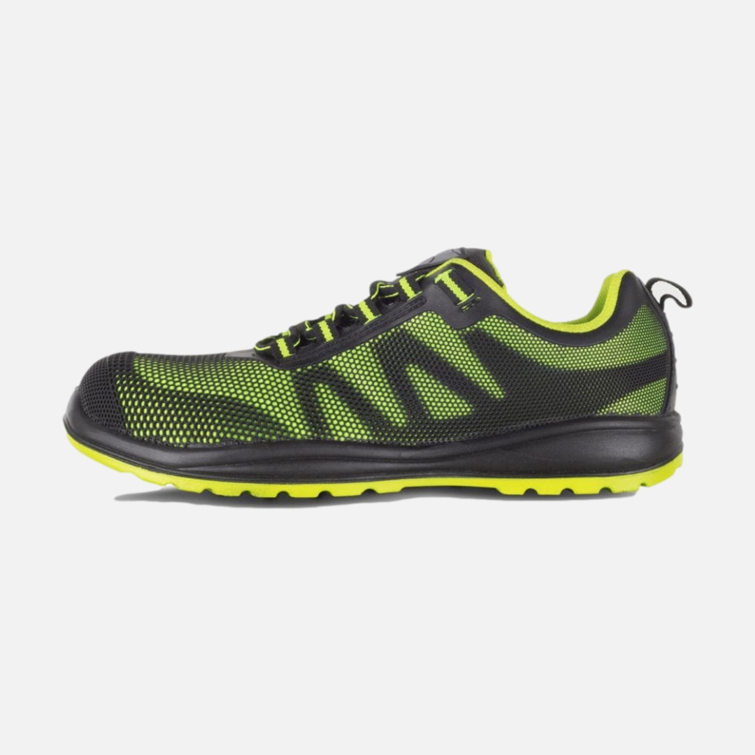 Sapato combinado com cordões. Isento de metal. Vivos refletores. Sola PU bidensidade combinada em duas cores. Presilha para pegar na parte superior do calcanhar para uma maior comodidade. Partes laterais combinadas com camadas sobrepostas. Biqueira de composite anti-impactos e palmilha têxtil anti-perfuração. Propriedades antiestáticas. Absorção da energia na zona do salto. Resistente aos hidrocarbonetos. Resistente à perfuração. S1P.