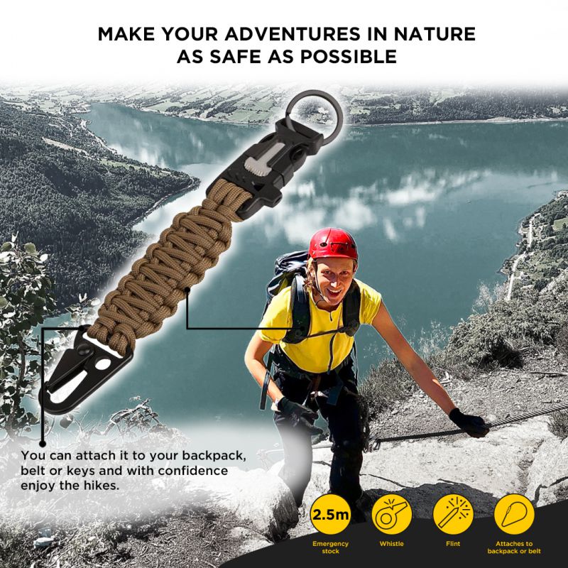 Our heavy duty paracord keychain includes 5 essential survival tools to help make camping, hunting or hiking safer: