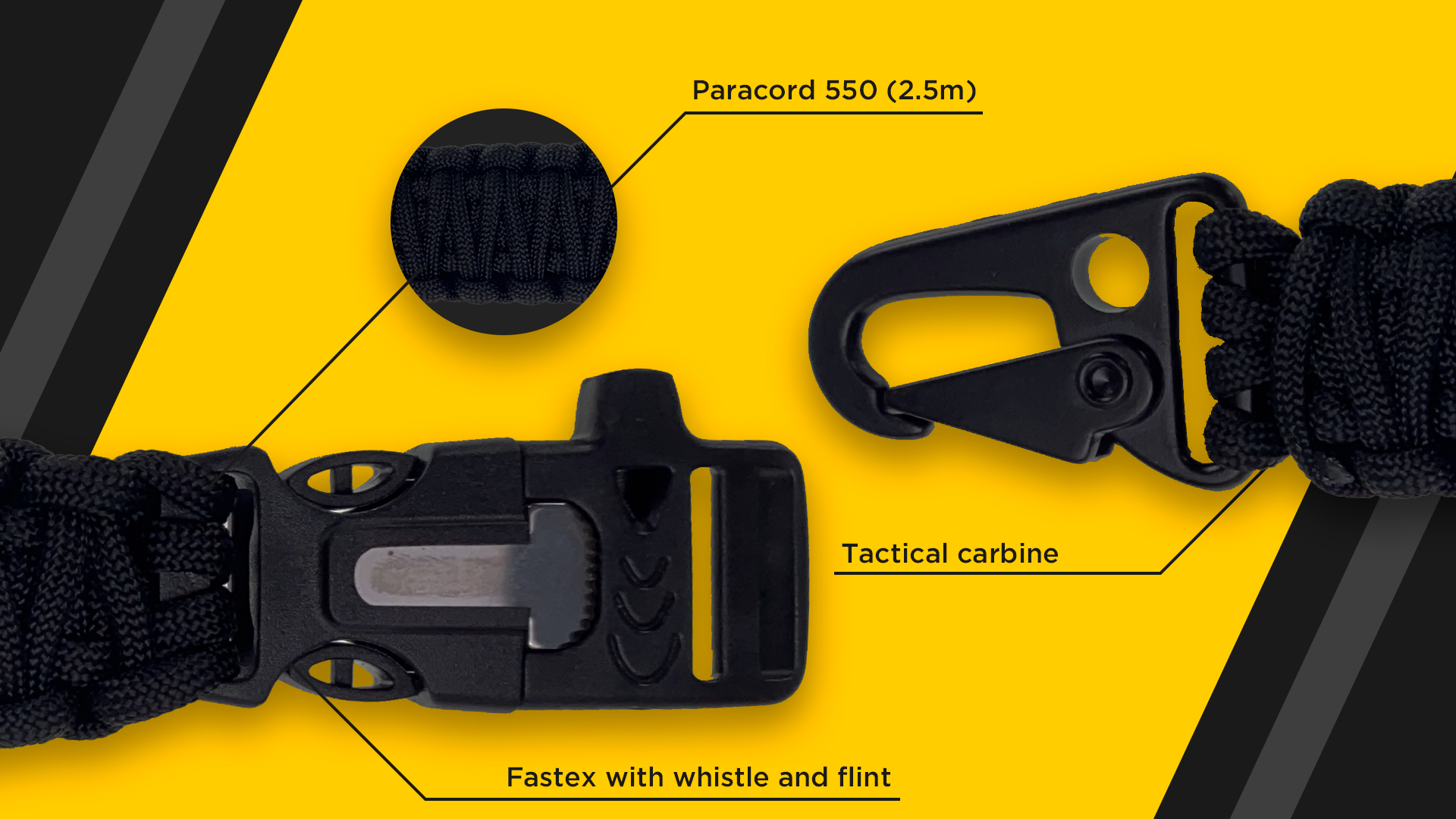 🧵 Material: 550 paracord, stainless carabiner and key ring, fastex and acetal whistle, flint rod and scraper