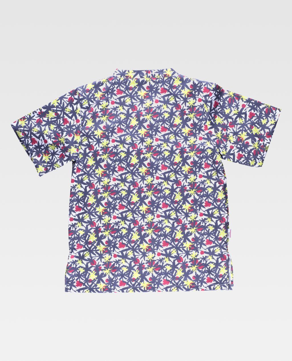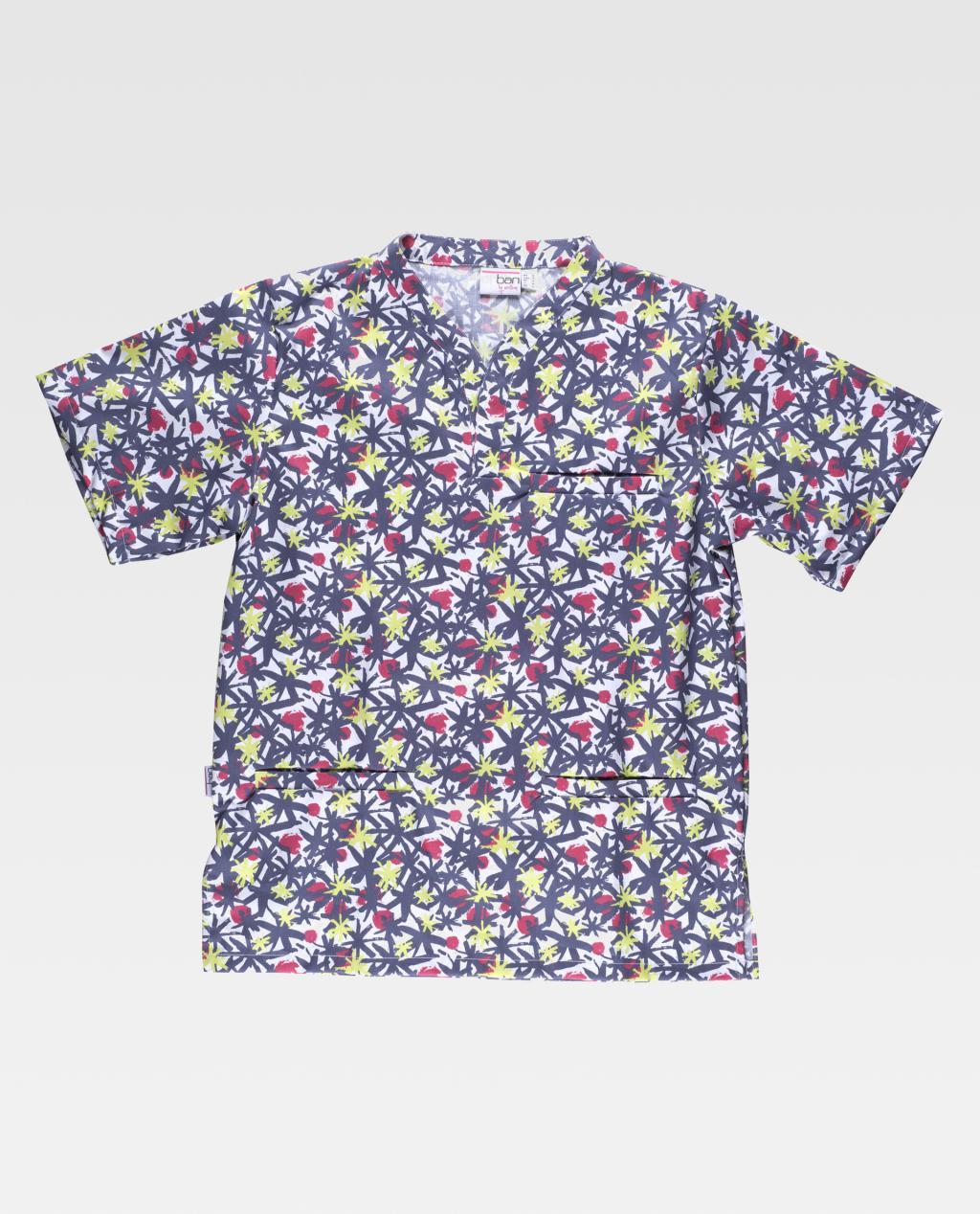 Túnica unissex de manga curta com impresso multicolor e acabamento anti-nódoas.