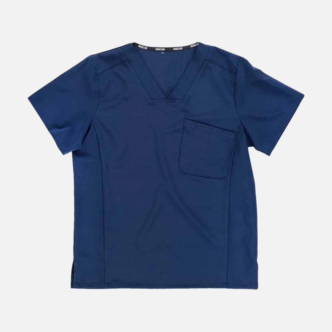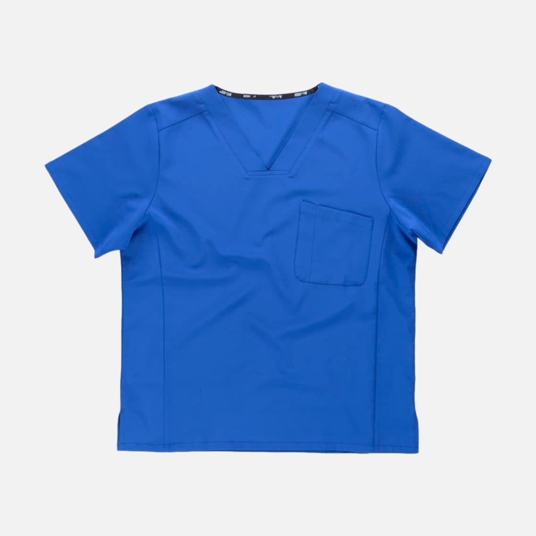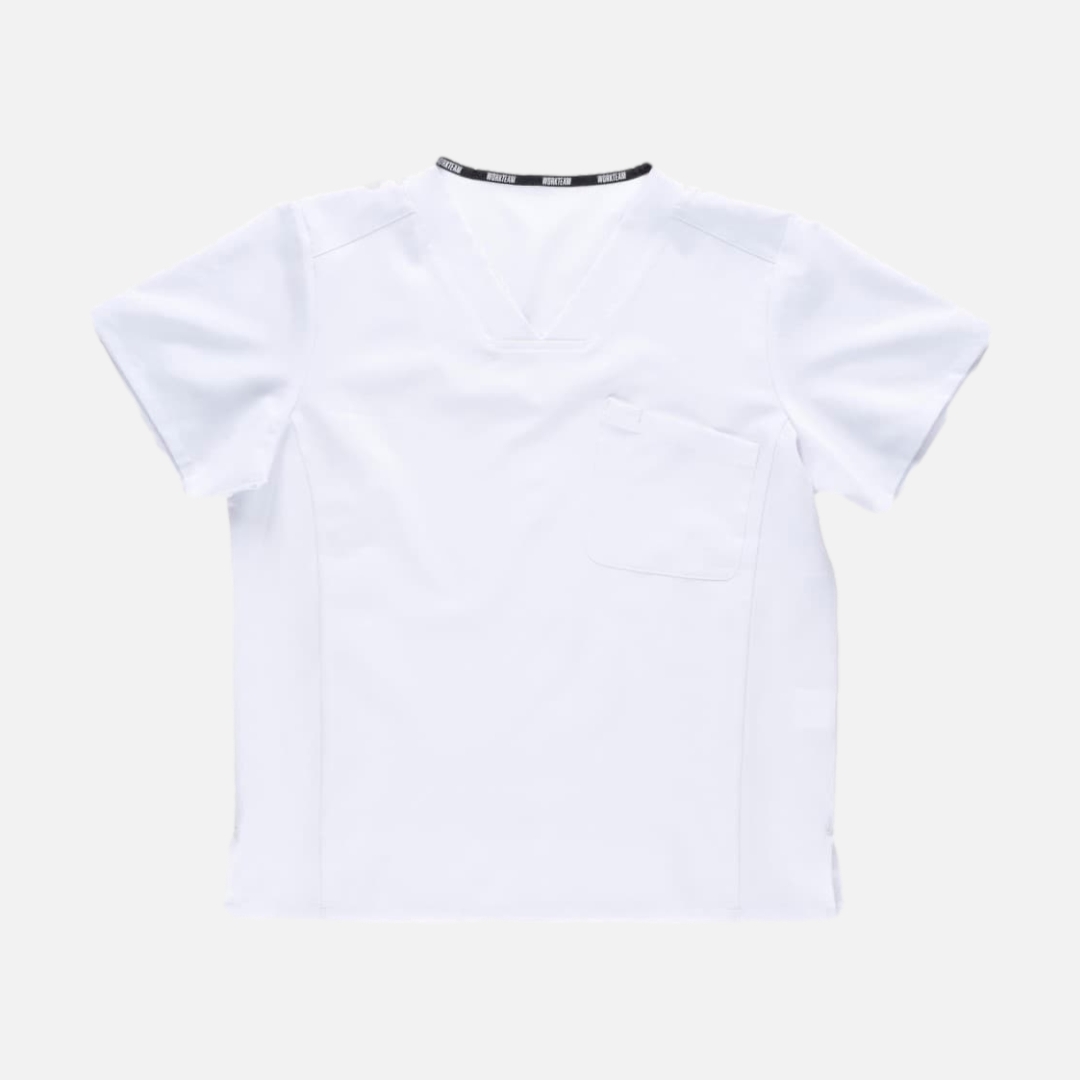 Túnica unissexo de manga curta com tecido elástico. Gola a bico. Um bolso de chapa no peito. Um bolso para canetas. Aberturas nos laterais.