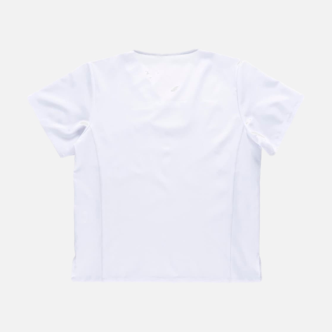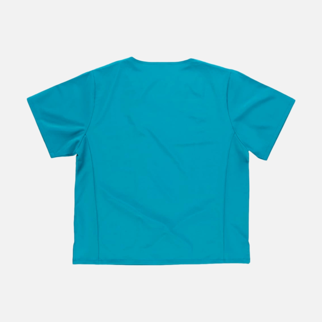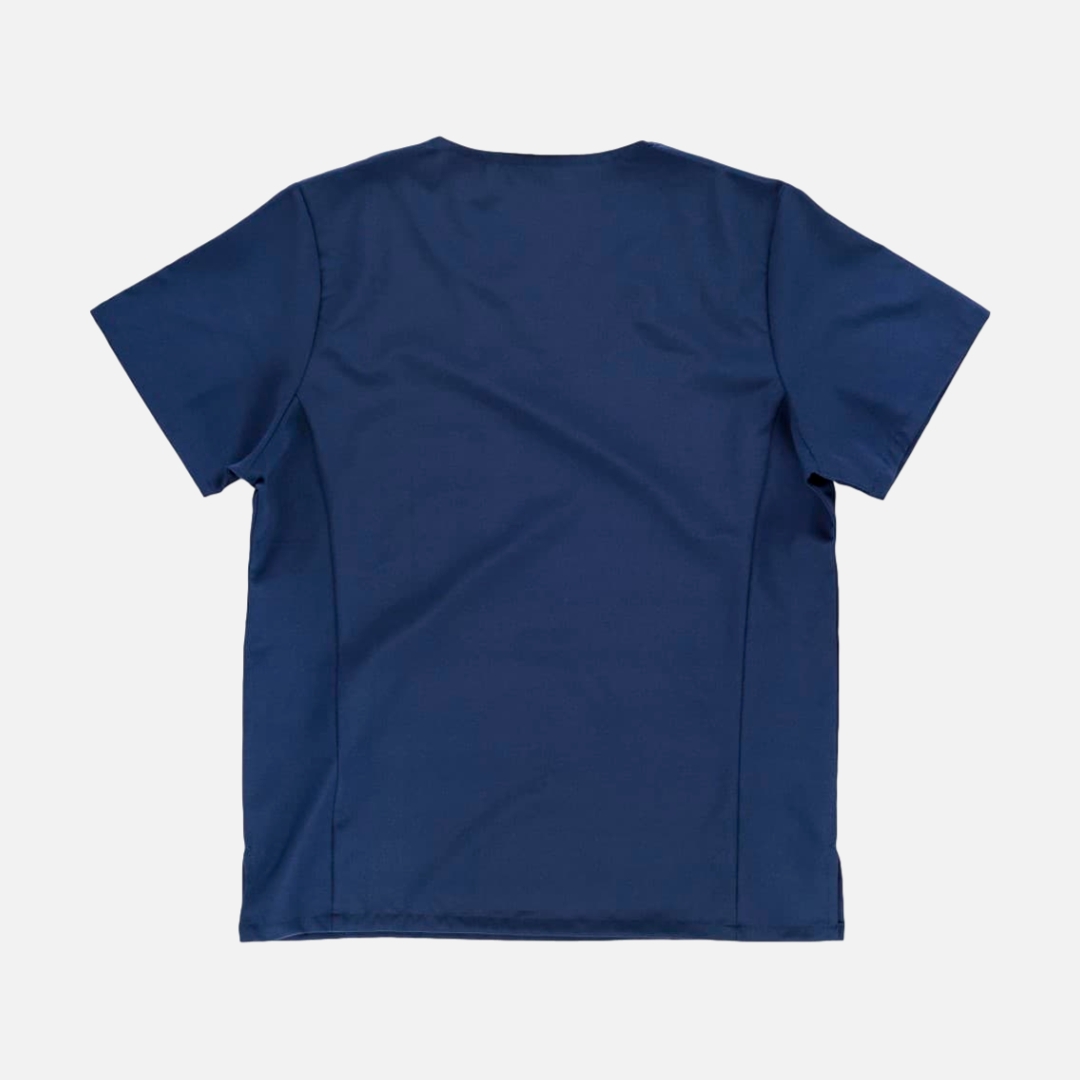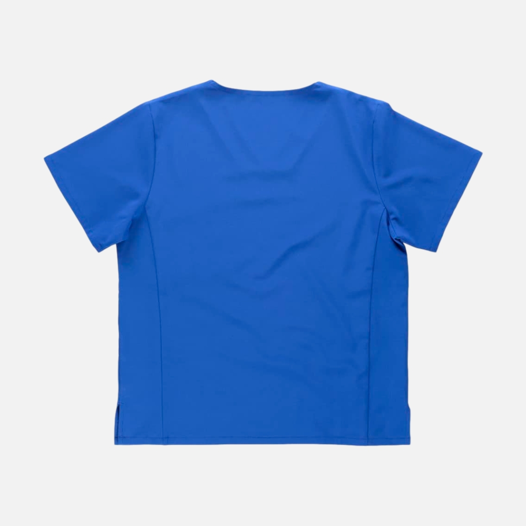 Túnica unissexo de manga curta com tecido elástico. Gola a bico. Um bolso de chapa no peito. Um bolso para canetas. Aberturas nos laterais.