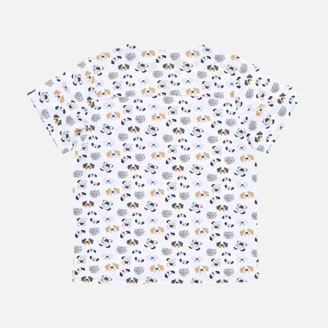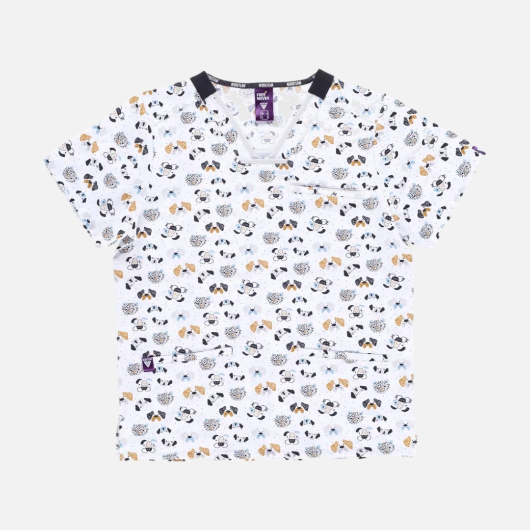 Túnica unissexo de manga curta com tecido elástico e estampada. Gola a bico com biés e elásticos combinados. Debrum nas costas. Um bolso no peito e dois laterais, aberturas nos laterais. Tecido com estampagem de cães.
