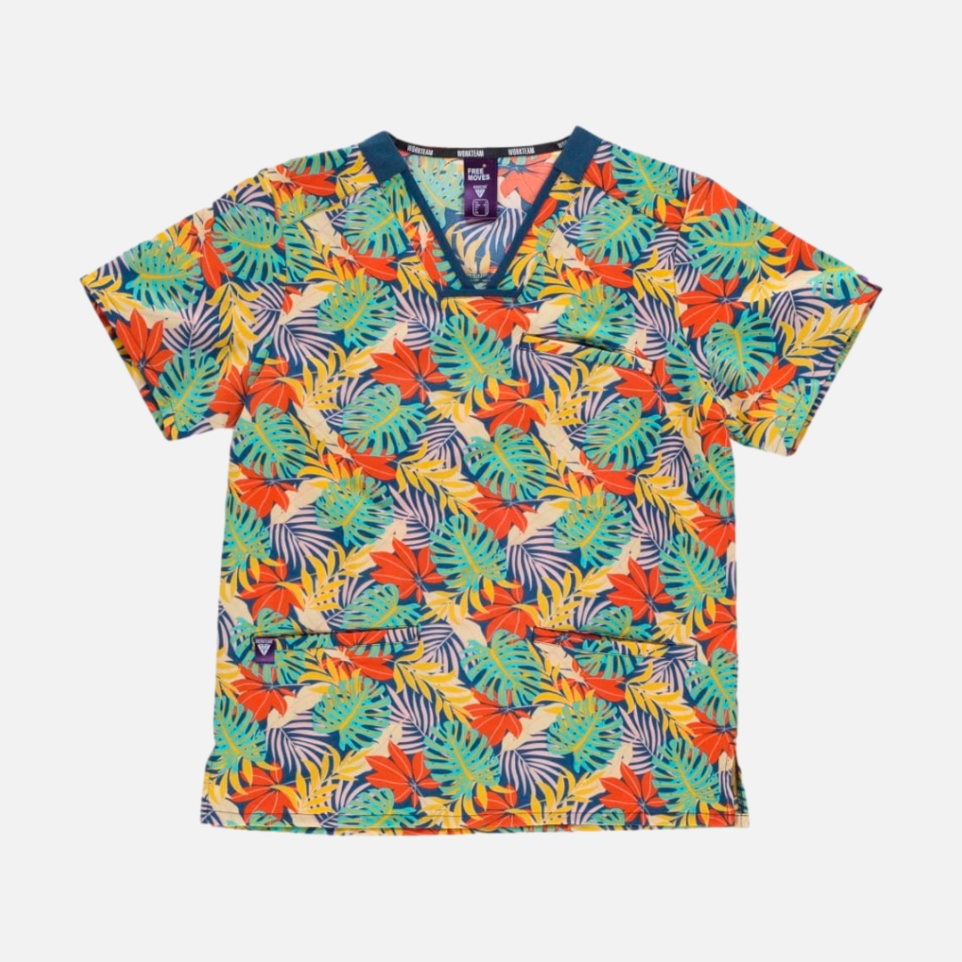 Túnica unissexo de manga curta com tecido elástico e estampada. Gola a bico com biés e elásticos combinados. Debrum nas costas. Um bolso no peito e dois laterais, aberturas nos laterais. Tecido com estampagem de caras