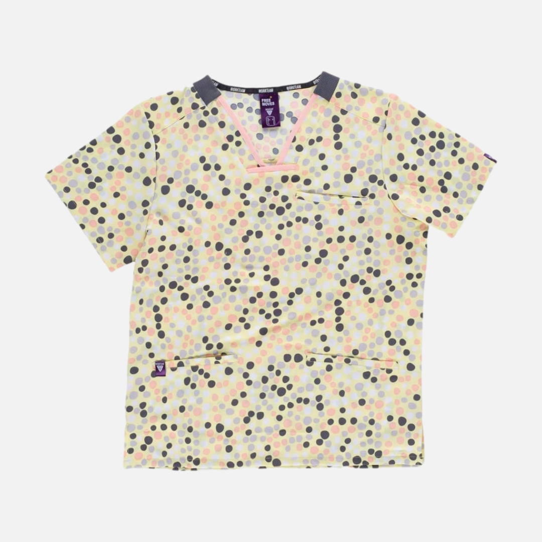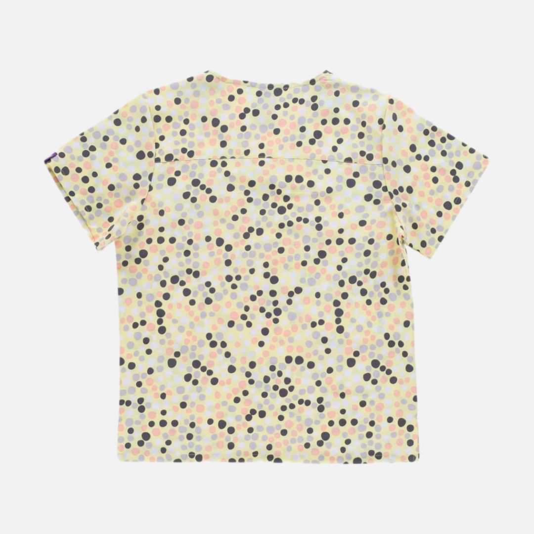 Túnica unissexo de manga curta com tecido elástico e estampada. Gola a bico com biés e elásticos combinados. Debrum nas costas. Um bolso no peito e dois laterais, aberturas nos laterais. Tecido com estampagem de pintas.