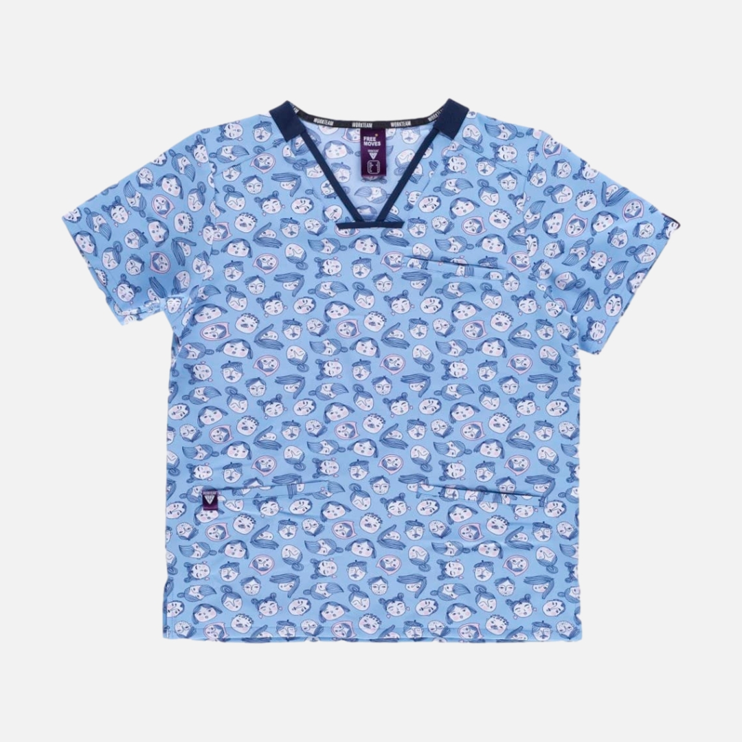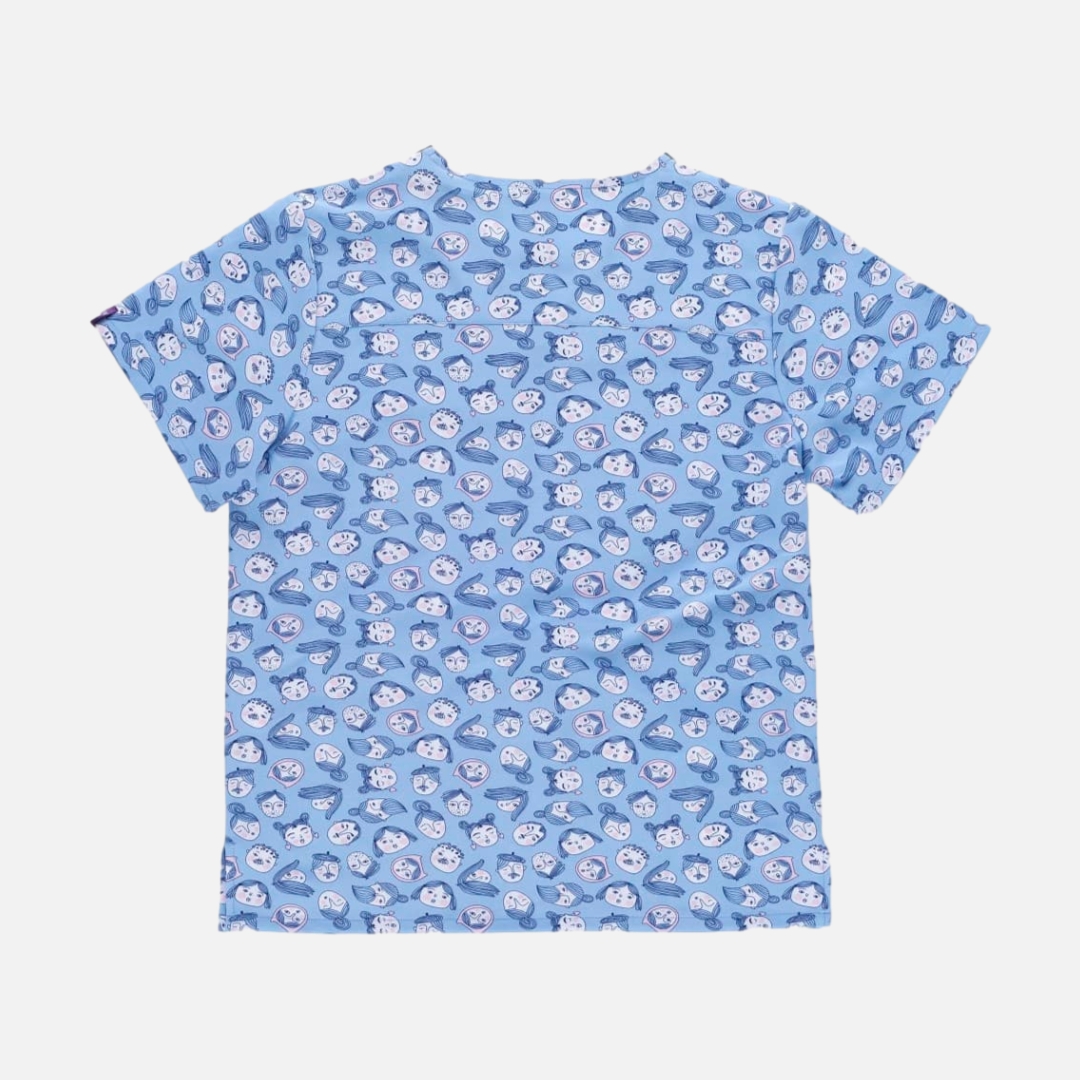 Túnica unissexo de manga curta com tecido elástico e estampada. Gola a bico com biés e elásticos combinados. Debrum nas costas. Um bolso no peito e dois laterais, aberturas nos laterais. Tecido com estampagem de caras